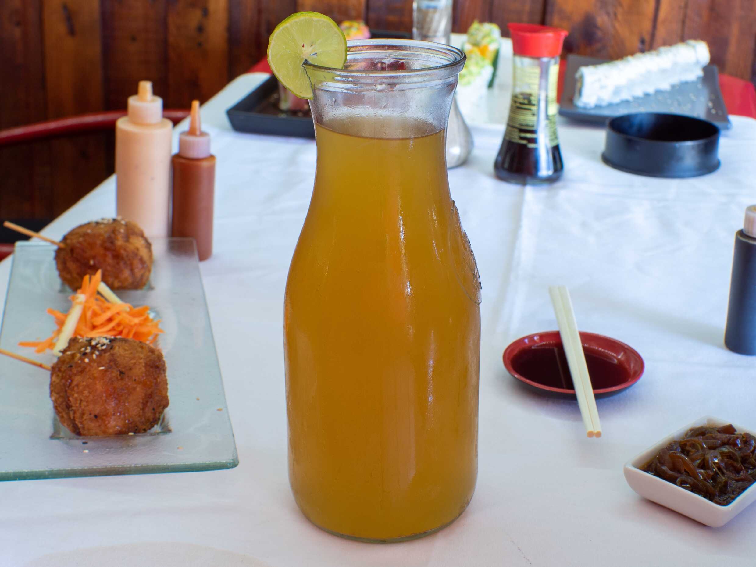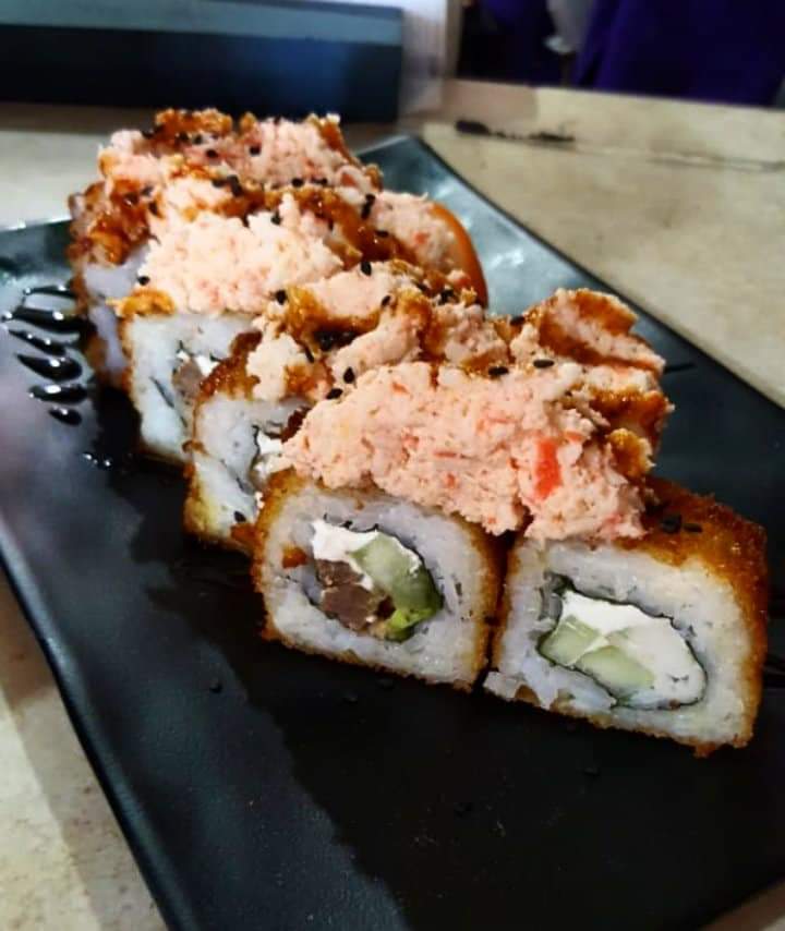 Por dentro salmón, kanikama, atún y camarón, por fuera tampico y verduras tempura con salsa tailandesa.