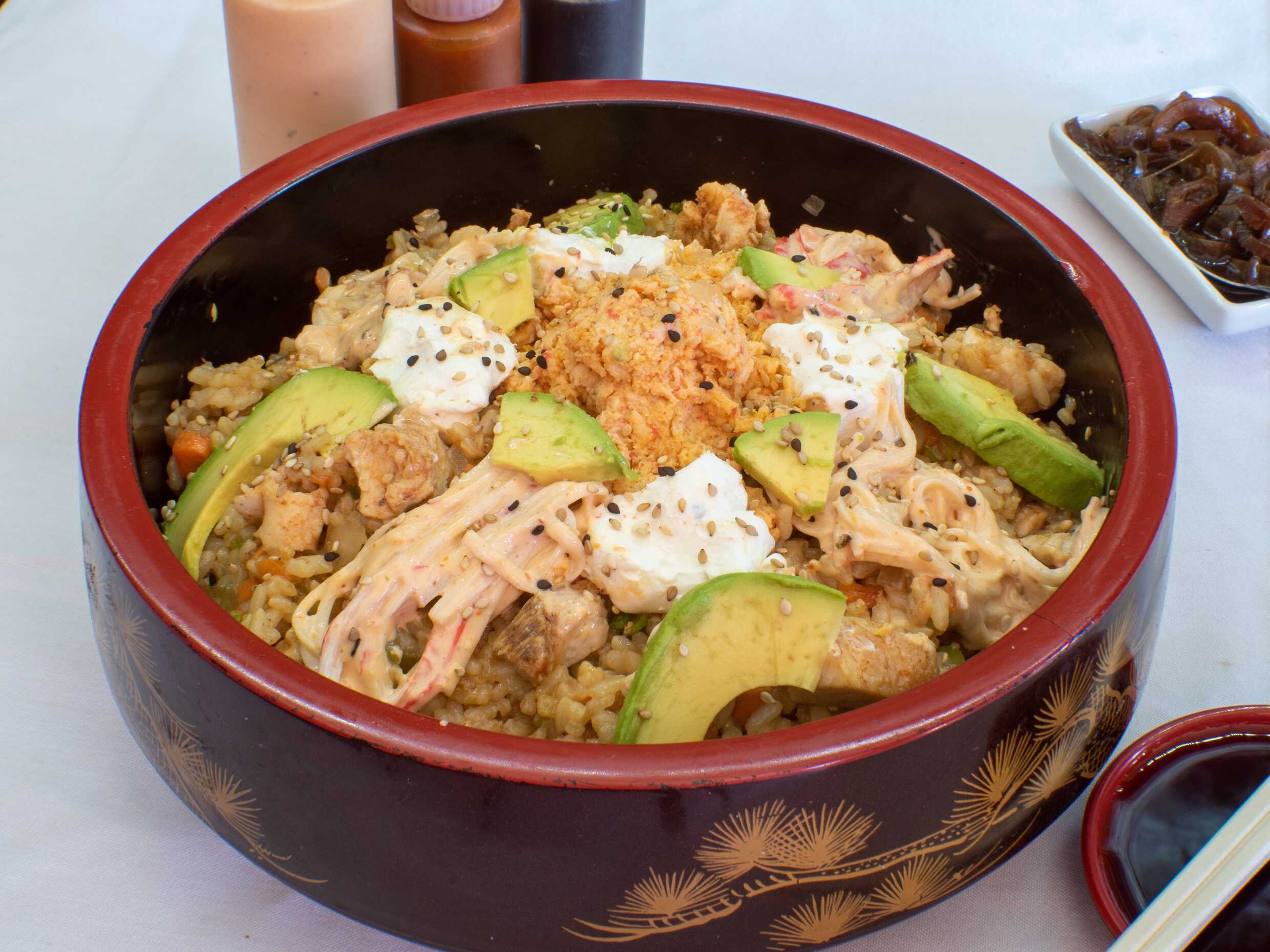Arroz sazonado con vegetales, aderezo, tampico, queso crema y aguacate.