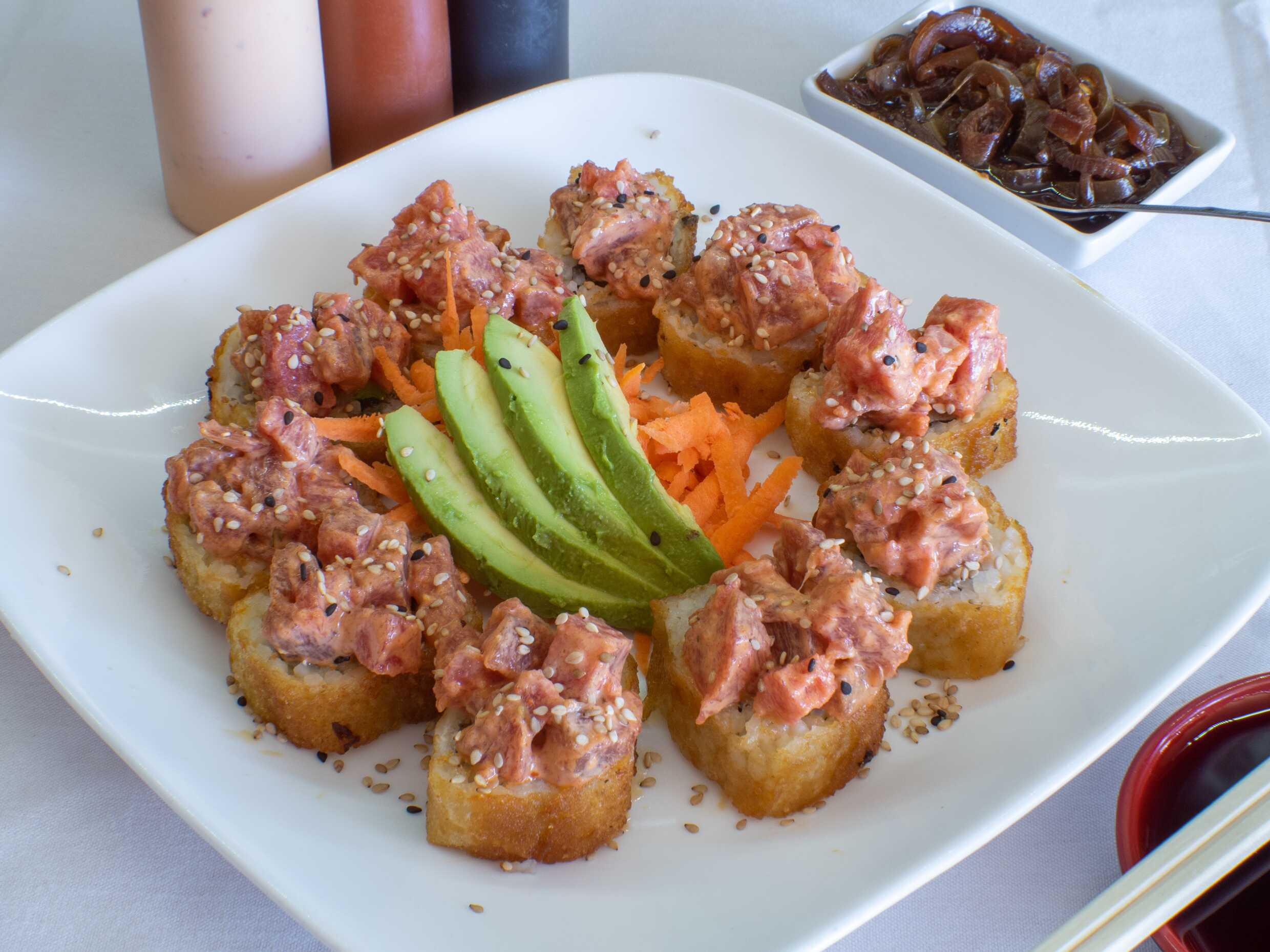 Cortes de atún, rellenos de un spicy de kanikama, aguacate y pepino, bañado en aderezo cilantro y salsa serranito.
