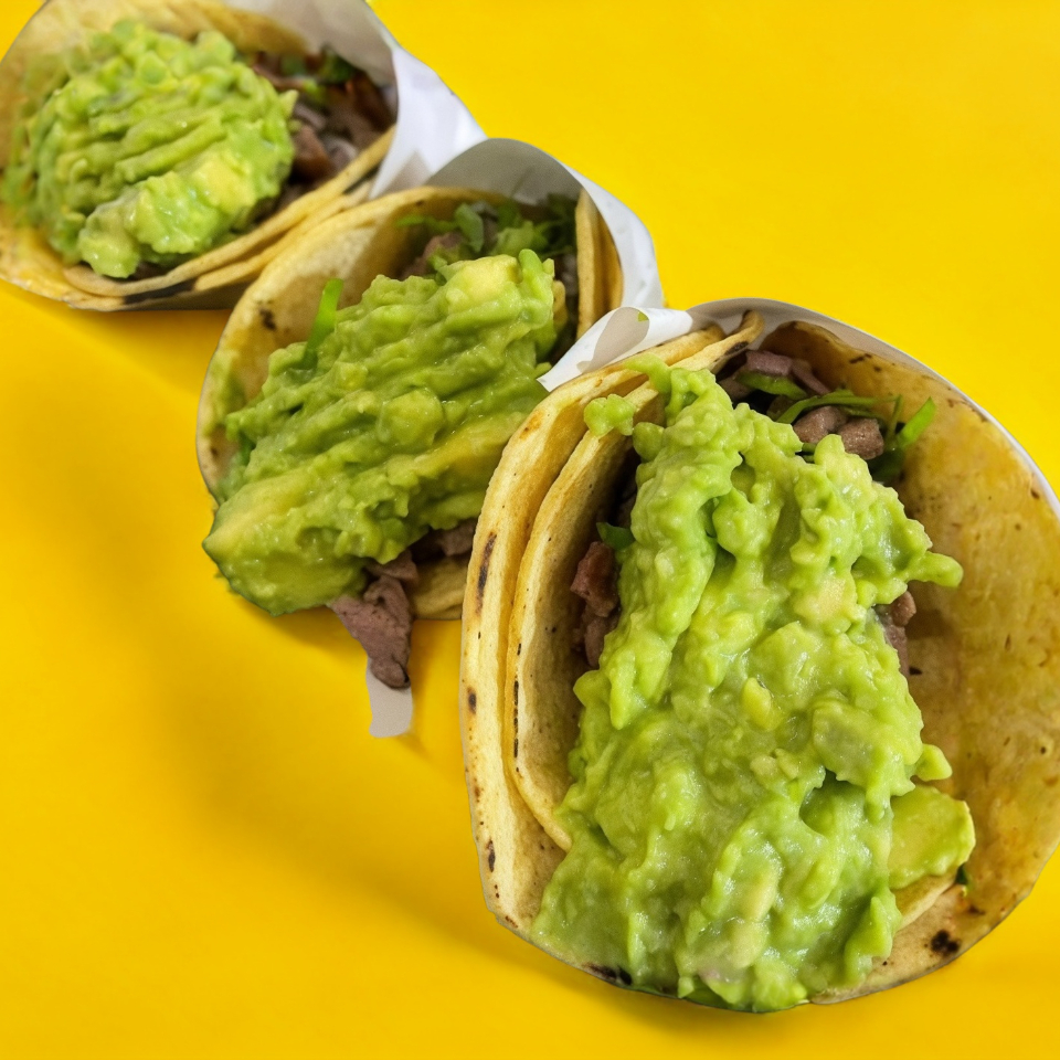 Tortilla de Maíz, Carne Asada, Cebolla, Cilantro, Guacamole