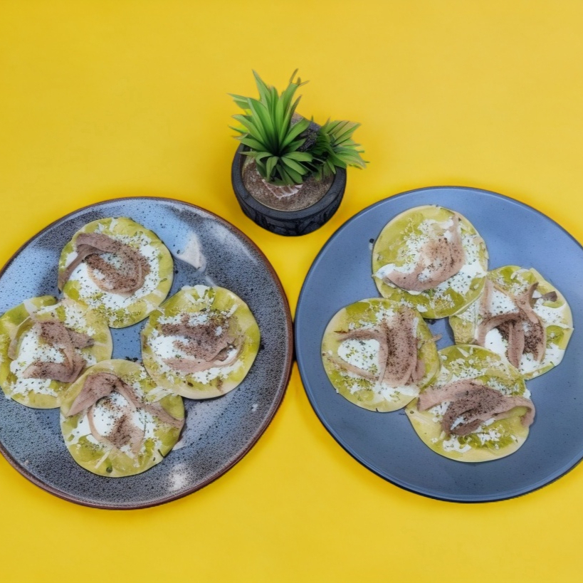 4 piezas. Carne, Cebolla, Cilantro, Queso Cotija y Tortilla de Maíz. Bañado en salsa verde