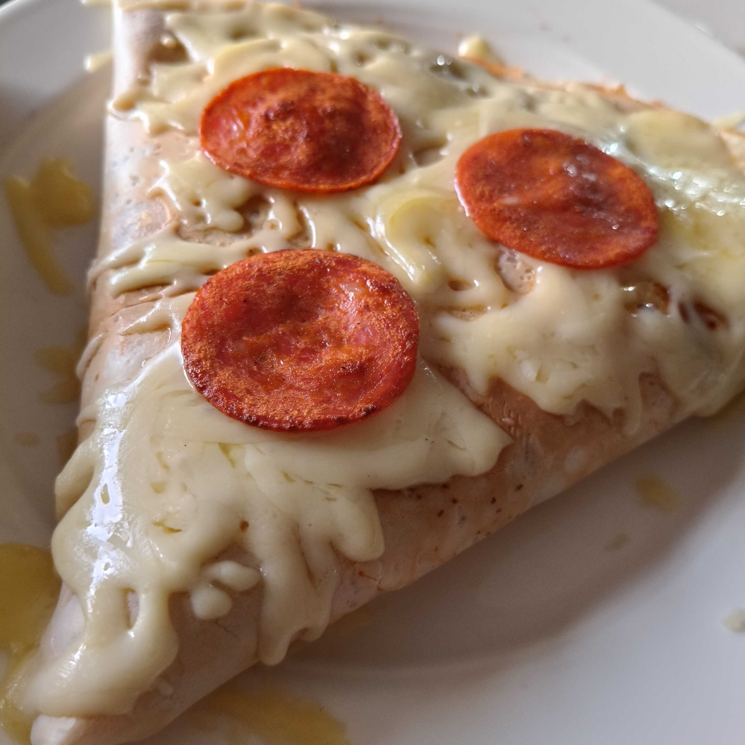 crepa con queso mozarela , salsa de tomate casera con rodajas de pepperoni .