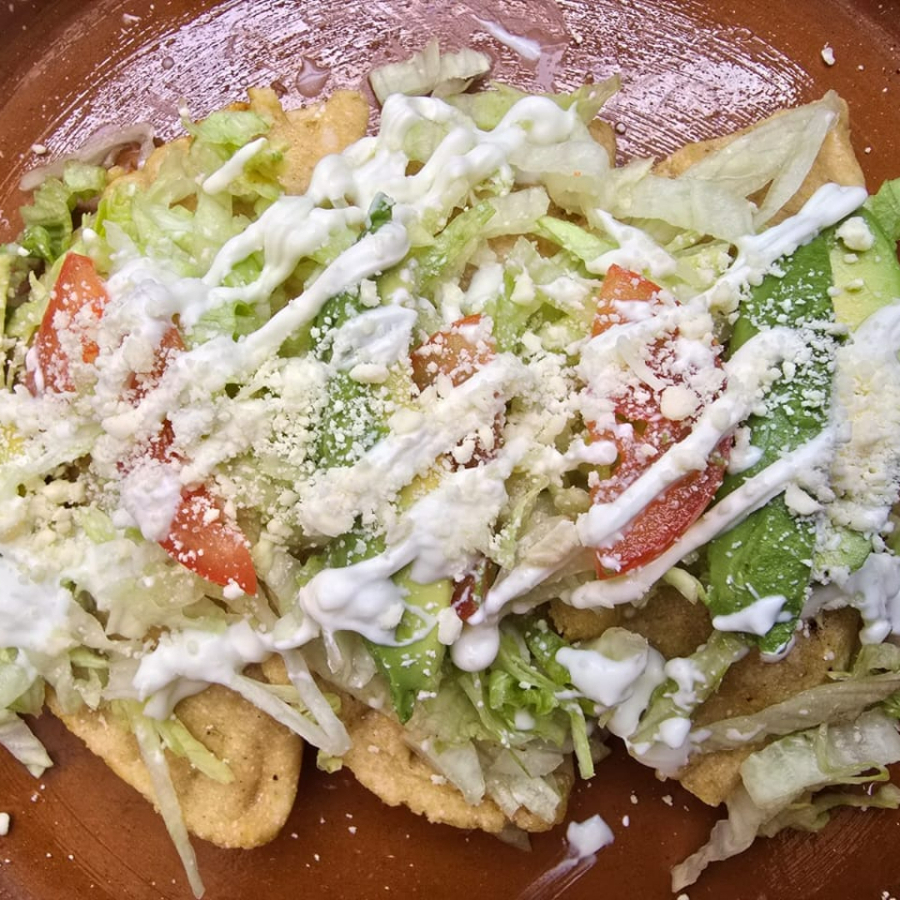 3pz De Totilla de maiz frita untada con frijores refritos como base coronada con carne de res deshebrada bien sazonada acompañada de lechuga, tomate, aguacate, crema y queso.