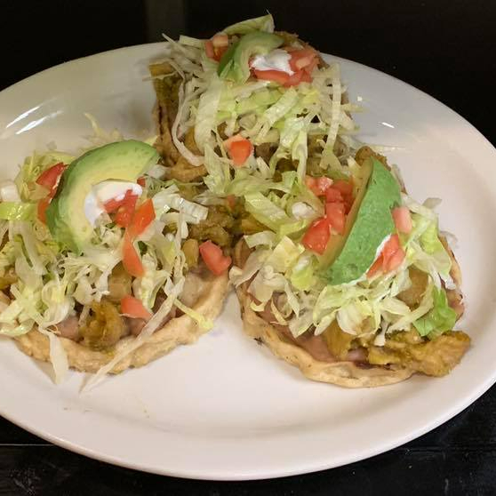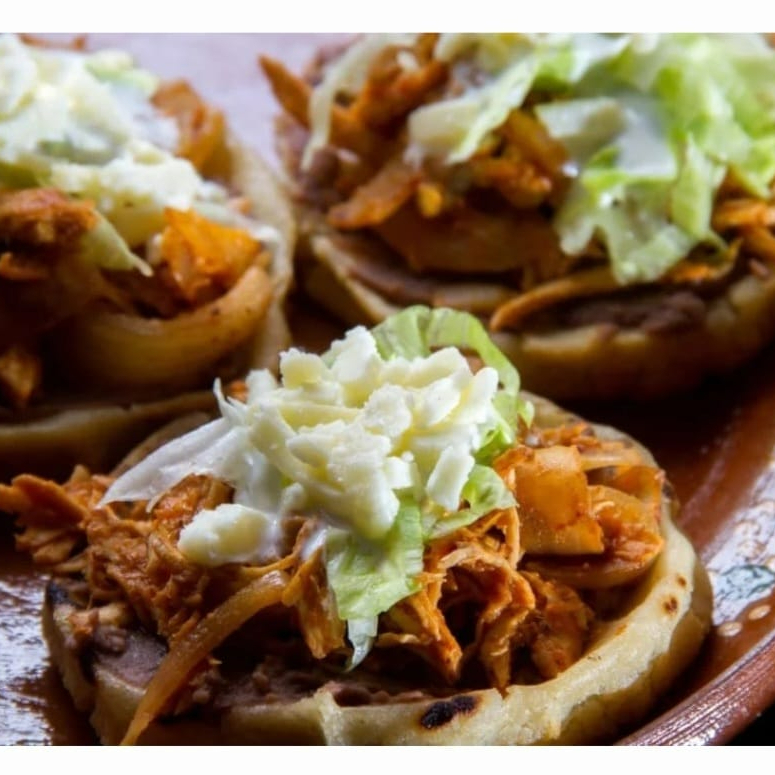 Ricoe sopes echos de masa de nixtamal untados con asientos de puerko y frijoles refritos con chicharron en salsa verde encima acompañado de lechuga, tomate, aguacate, crema y queso.
