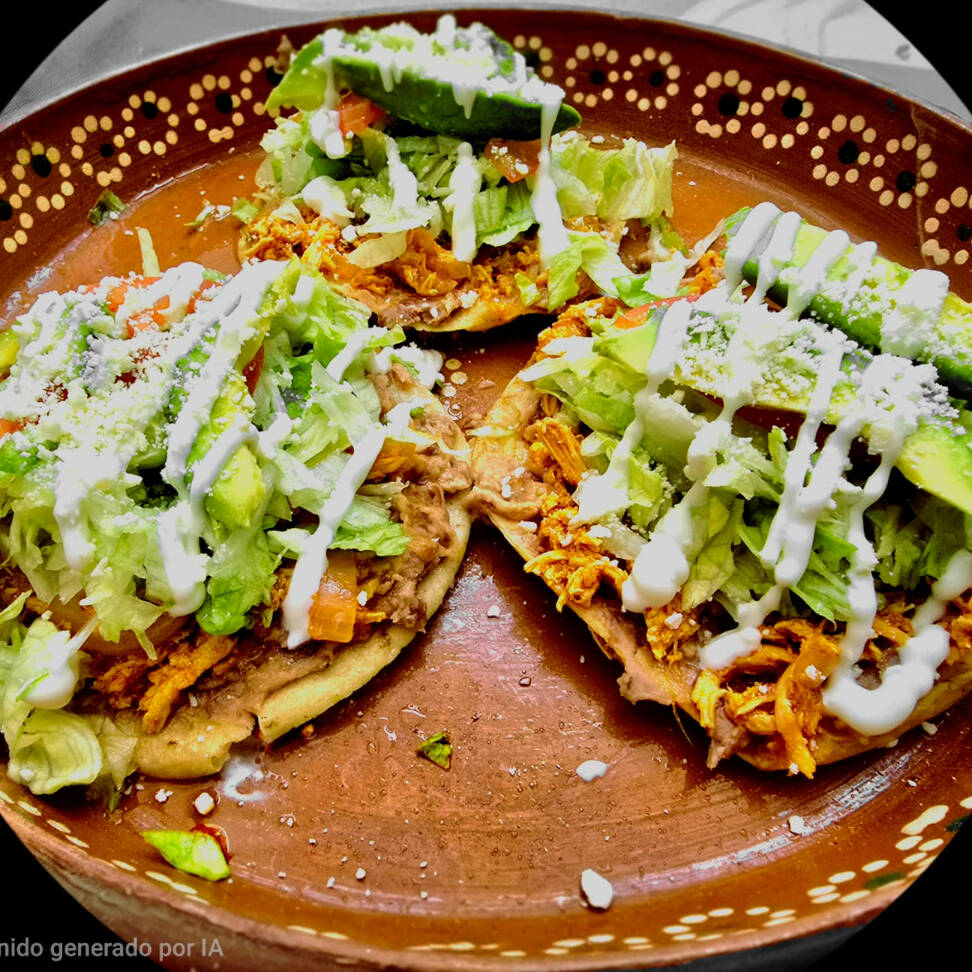 Tortilla frita untada con frijoles refritos y guisado de pollo desebrado con chipptle y tomate acompañado de lechuga, tomate, aguacate, crema y queso.