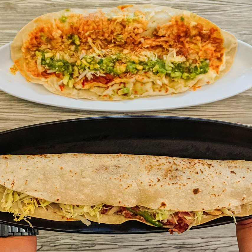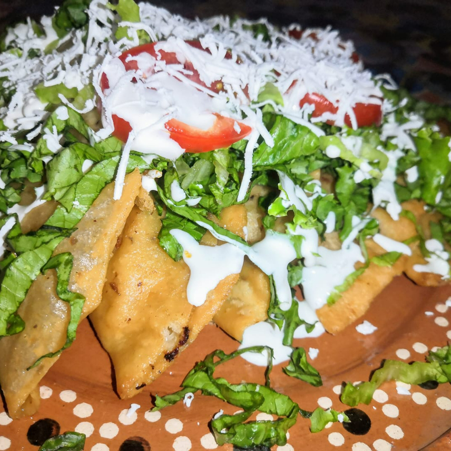 Deliciosas empanaditas de maiz fritas con queso y carne desebrada en el interios con lechuga, tomate, aguacate, crema y queso de complemento.