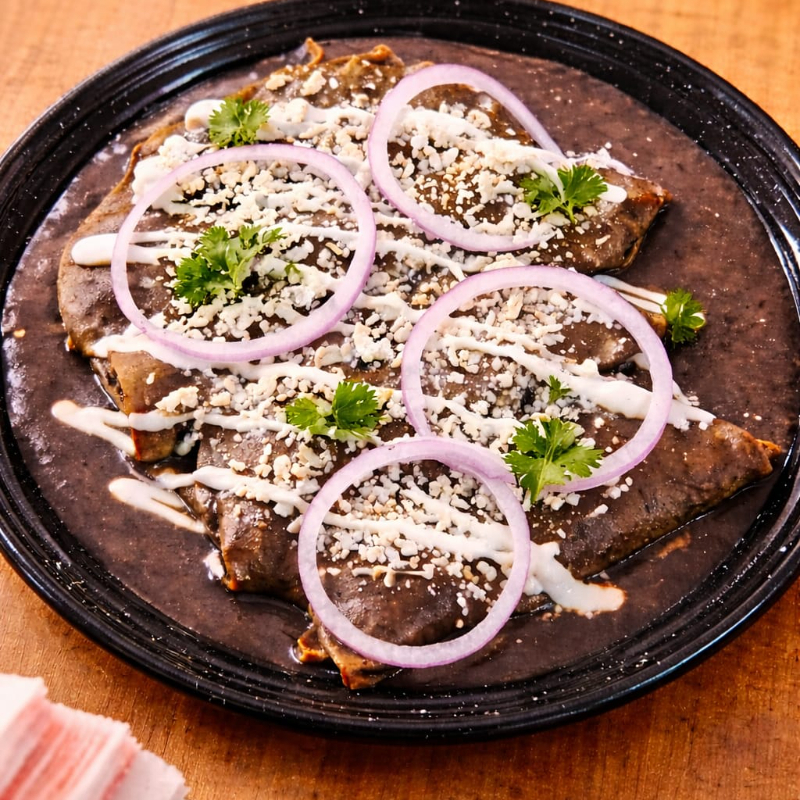 4 tortillas bien doraditas, rellenas de queso rallado y bañadas en frijoles negros refritos bien triturados y queso asadero gratinado con ese sabor casero que se siente en cada bocado 🤤 Coronadas con crema, queso, cebolla morada y cilantro fresco… 👉 Para los que disfrutan un sabor con carácter, de esos que no se olvidan.