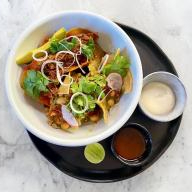 Crujientes totopos de maíz bañados en queso derretido, acompañados de carne sazonada con ajo, cebolla blanca picada y pimienta negra, decorados con jitomate fresco en cubos, cebolla morada finamente picada, rebanadas de chile jalapeño, crema espesa y un toque de cilantro fresco.