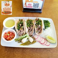 Trozos de bistec cocidos en salsa verde cremosa de tomatillo, chile serrano, cilantro, ajo y cebolla, con un toque de comino, servidos con arroz y frijoles.