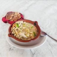 Caldo caldoso y aromático preparado con grano de maíz pozolero y carne de cerdo o pollo, cocido con ajo, cebolla, orégano, laurel y chile ancho o guajillo, acompañado de lechuga, rábano, cebolla blanca, orégano, limón y tostadas.