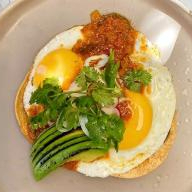 Dos huevos preparados a elección, salteados con jitomate fresco, cebolla blanca y chile serrano, sazonados con sal y pimienta, servidos con frijoles refritos y tortillas de maíz recién calentadas.