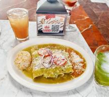 Tortillas de maíz rellenas de pollo o queso, bañadas en salsa verde o roja, cubiertas con crema fresca, queso desmoronado, cebolla morada fileteada y cilantro, acompañadas de arroz y frijoles.