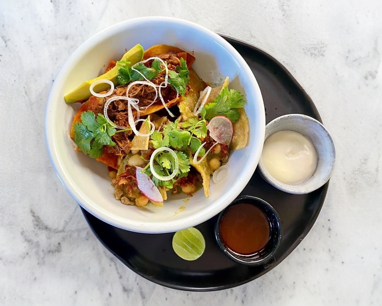 Tradicional orden de totopos bañados en frijoles, salsa mexicana, crema, guacamole y queso gratinado.