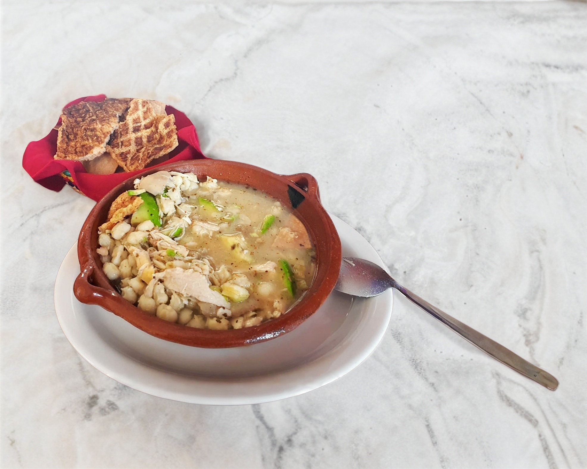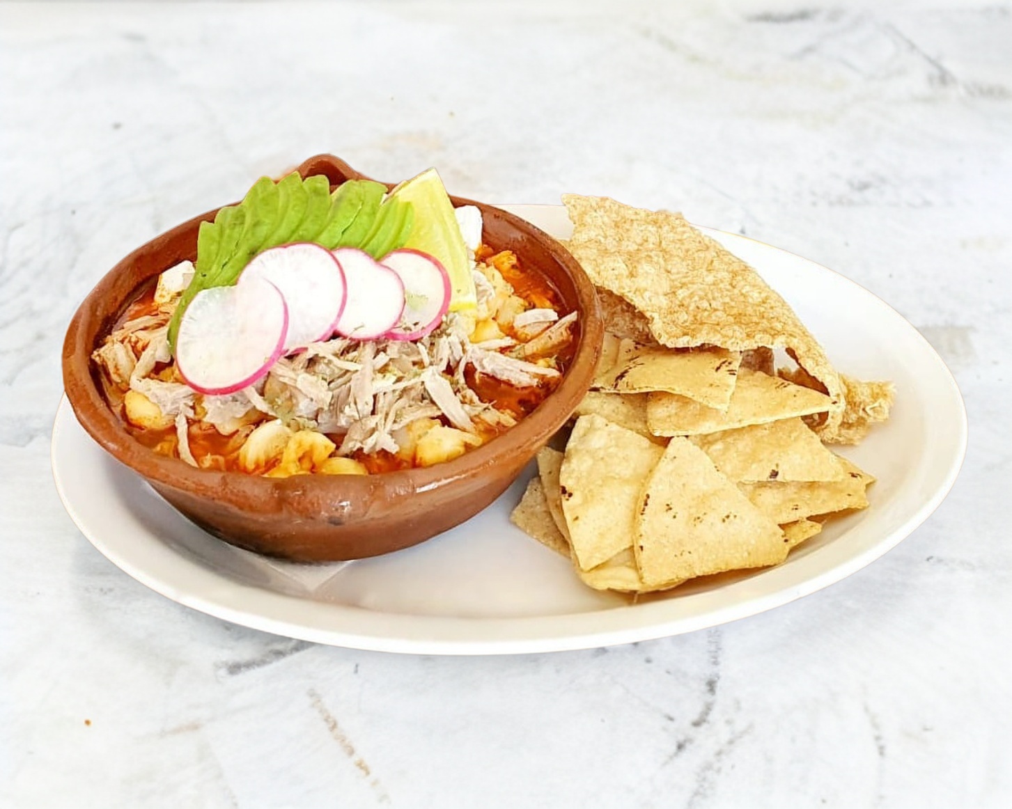 Blanco, verde o rojo. Estilo guerrero acompañado de botana que incluye chicharrón, aguacate, totopos, lechuga, cebolla y chile serrano.