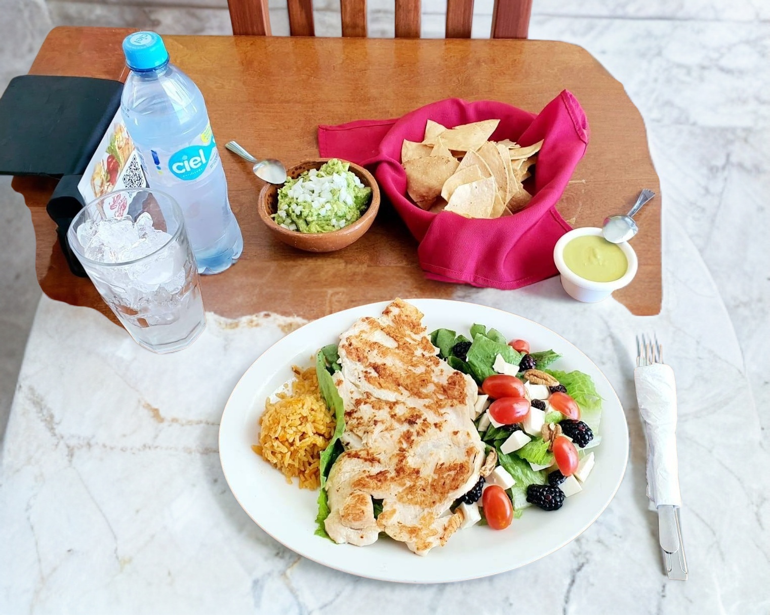 Pechuga de pollo empanizada o a la plancha acompañada de arroz, frijoles y ensalada.