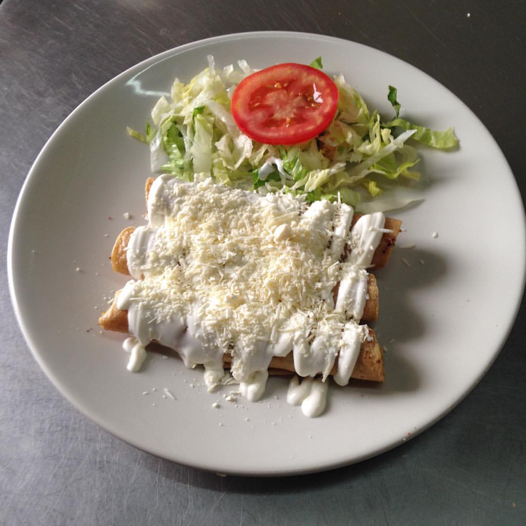 5 piezas de tortilla de maíz rellena de pollo, con lechuga, crema, queso aguacate, acompañado con frijoles y queso.