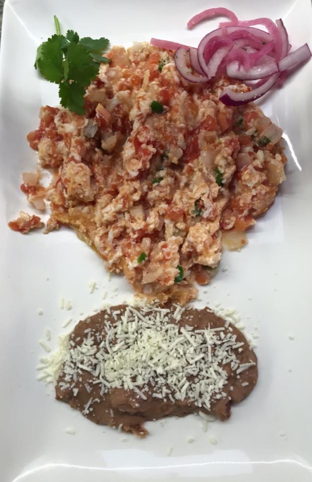2 piezas de huevo, con jitomate, cebolla y chile picado, acompañado con frijoles con queso y totopos y tortillas