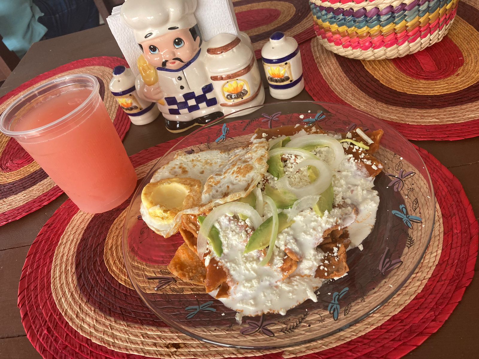 Chilaquiles rojos, con crema, queso, aguacate y cebolla, acompañados con 2 huevos estrellados y frijoles con queso