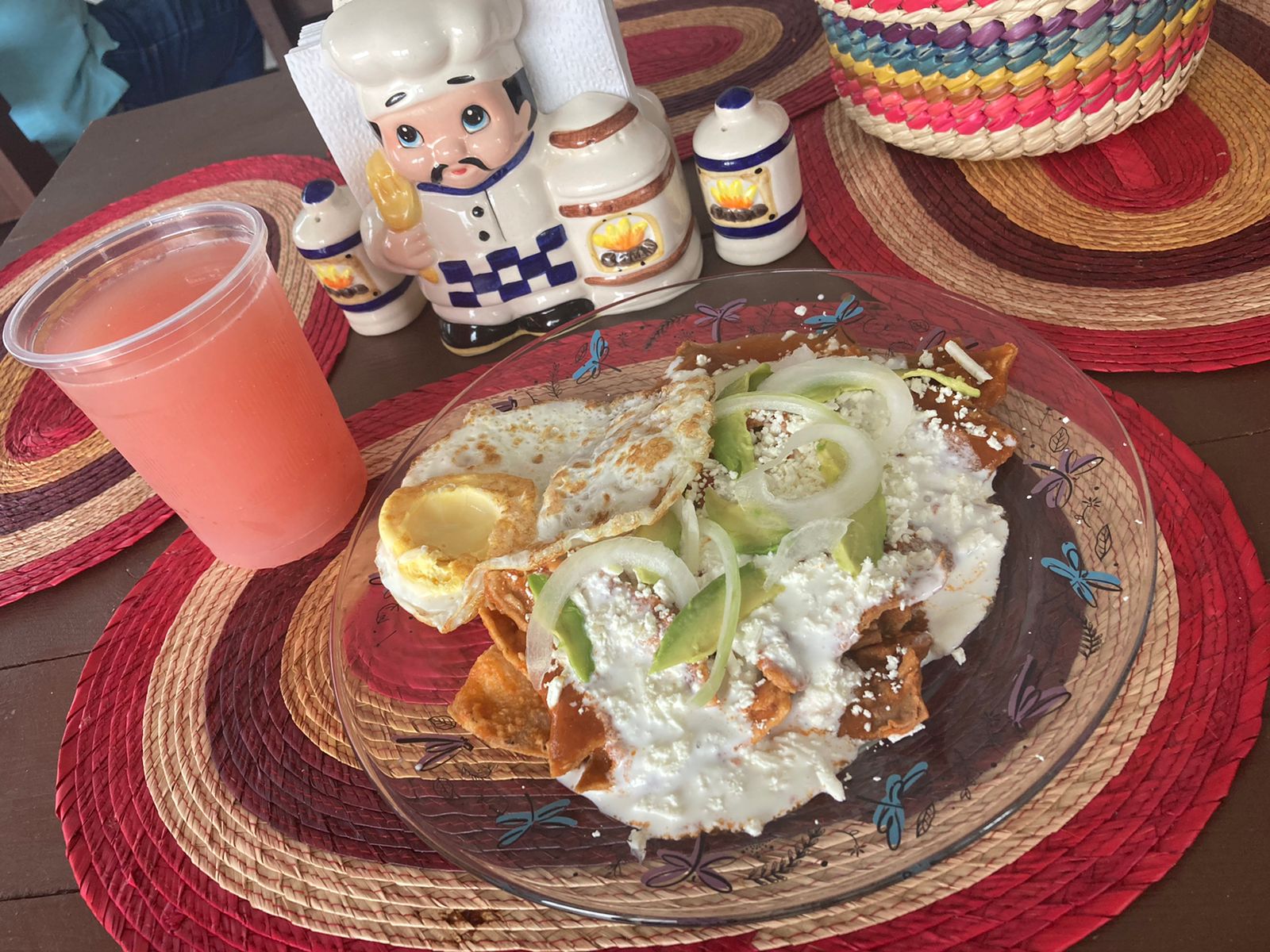 3 piezas de tortilla frita, con 2 huevos estrellados, bañados en salsa acompañados de frijoles con queso y totopos
