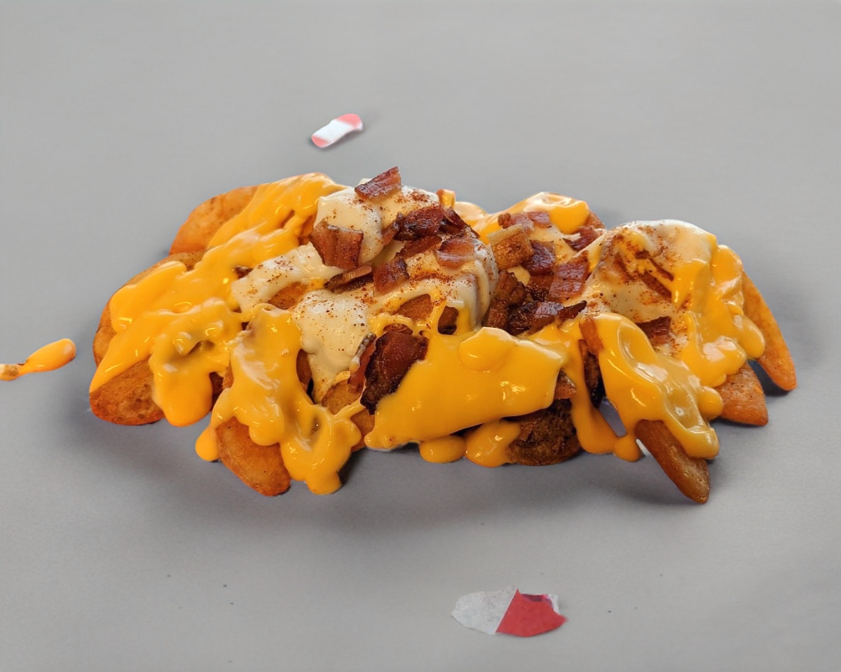 Gajos de papa natural, con paprika, queso amarillo, mozzarella y topping de tocino.