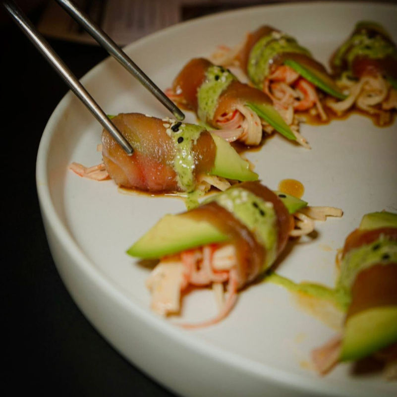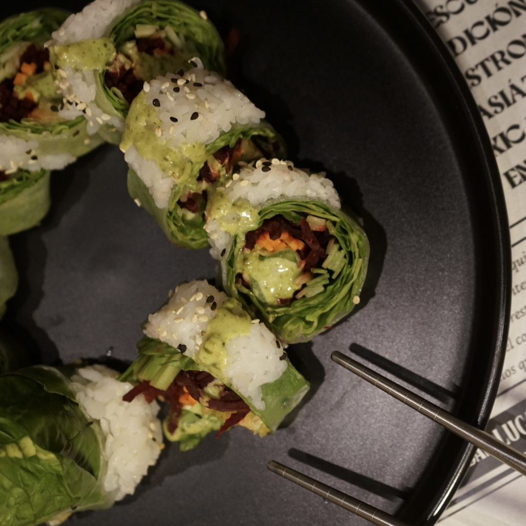 Hoja de lechuga, pepino, aguacate, zanahoria, betabel y esparrafo tempura envuelto en papel de arroz, coronado con un poco de arroz y un hilo de salsa de cilantro.