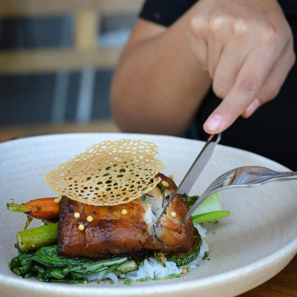 180 gramos de filete de pescado blanco fresco marinado en miso, acompañado de arroz.