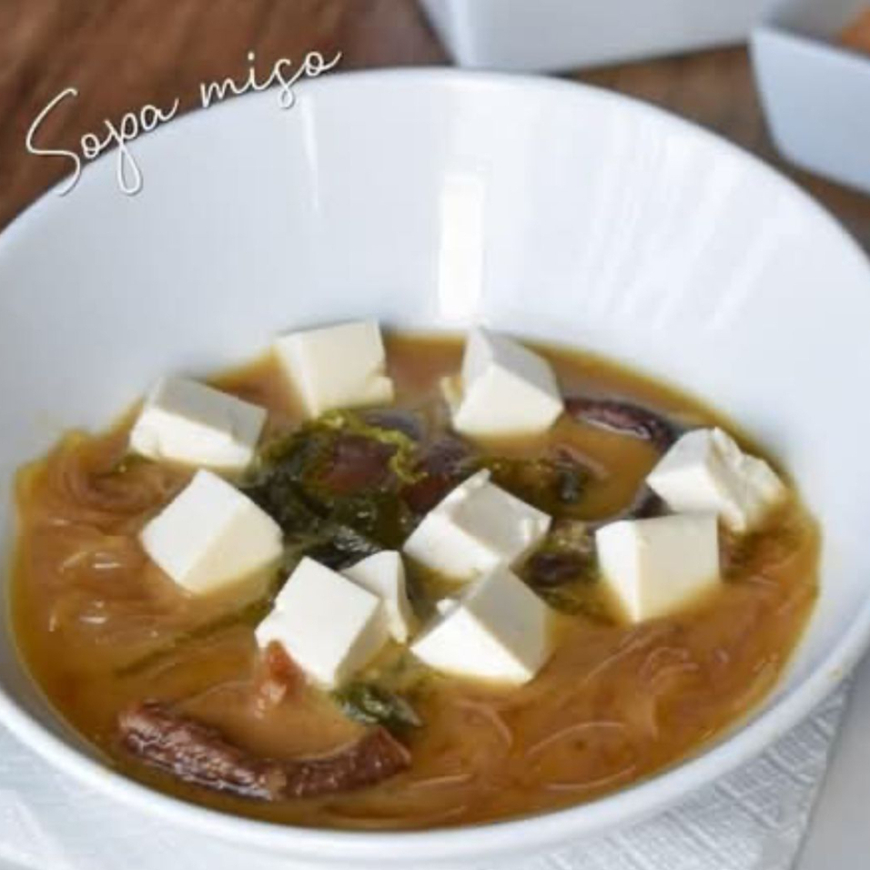 Clasica sopa japonesa a base de dashi y miso. Servido con tofu suave, alga nori y cebollín.
