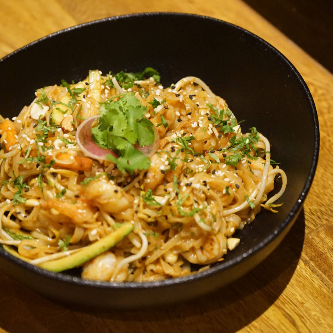 Fideos de arroz salteados con salsa de tamarindo y chile morita, verduras, brotes de soya, cacahuates, cilantro y camarones.
