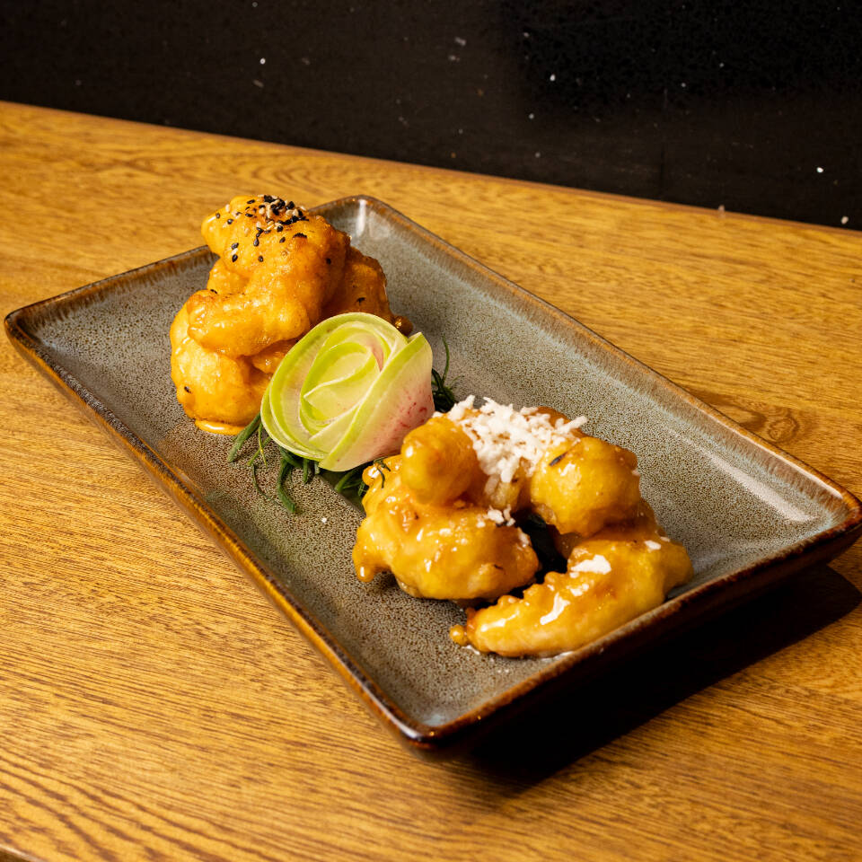 Camarones en tempura crujiente, servidos con aderezo dulce y aderezo picante flameado , coco y ajonjolí.