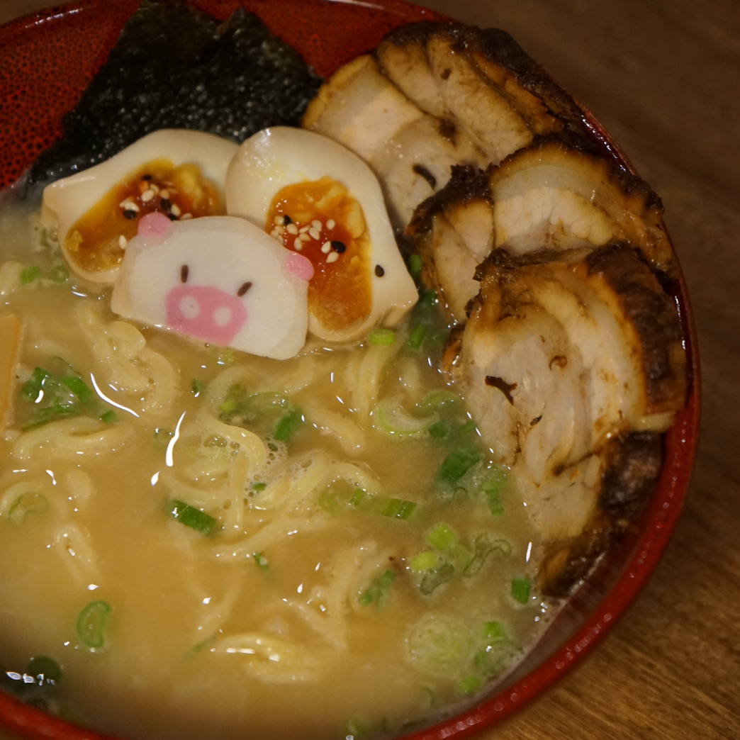 Fideos servidos con delicioso y aromático caldo de cerdo cocido a fuego lento durante 18 horas, chashu (porkbelly marinado), huevos tiernos marinados en soya, naruto, alga nori y cebollín.