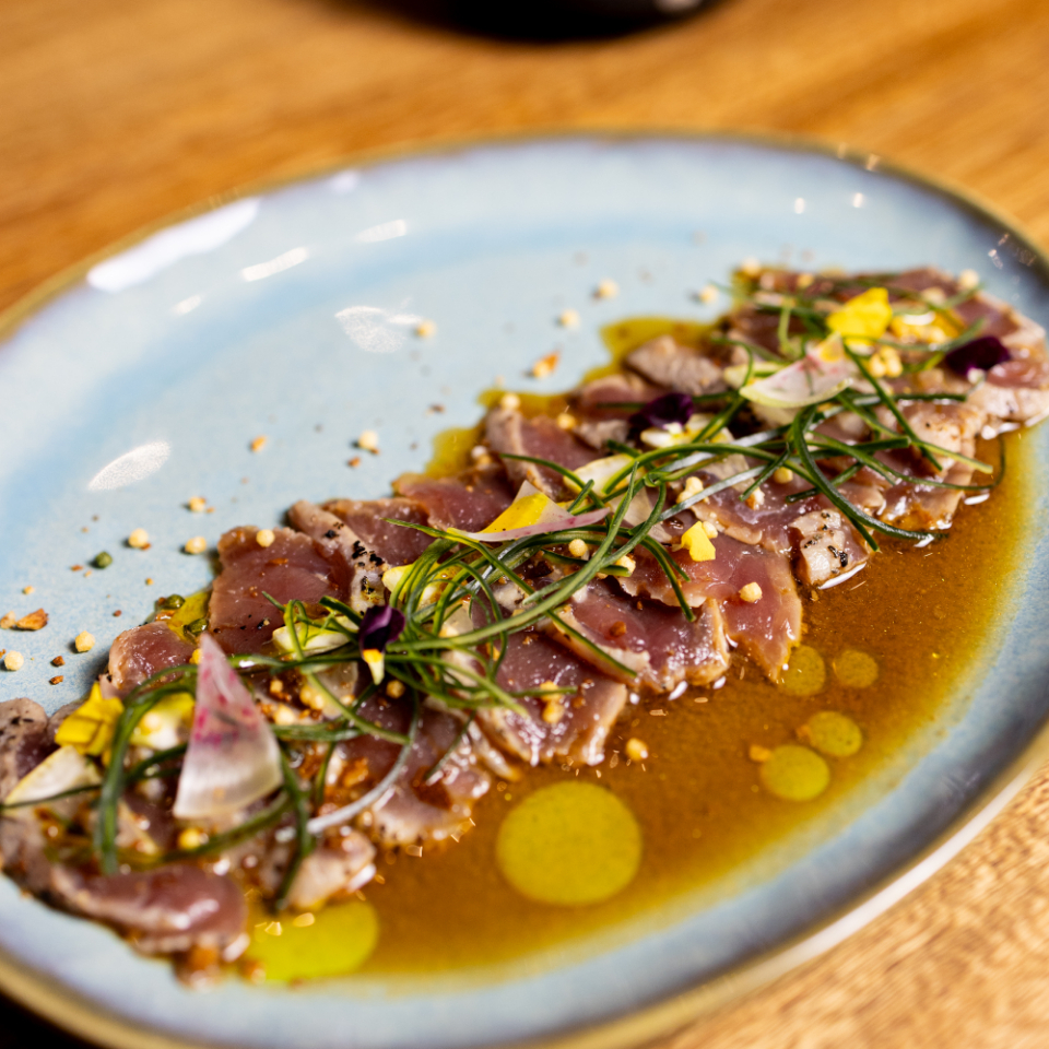 Cortes delgados de atún sellado black and white servido con finas láminas de limón real, ajo tostado, salsa serranito y un hilo de aceite curry.