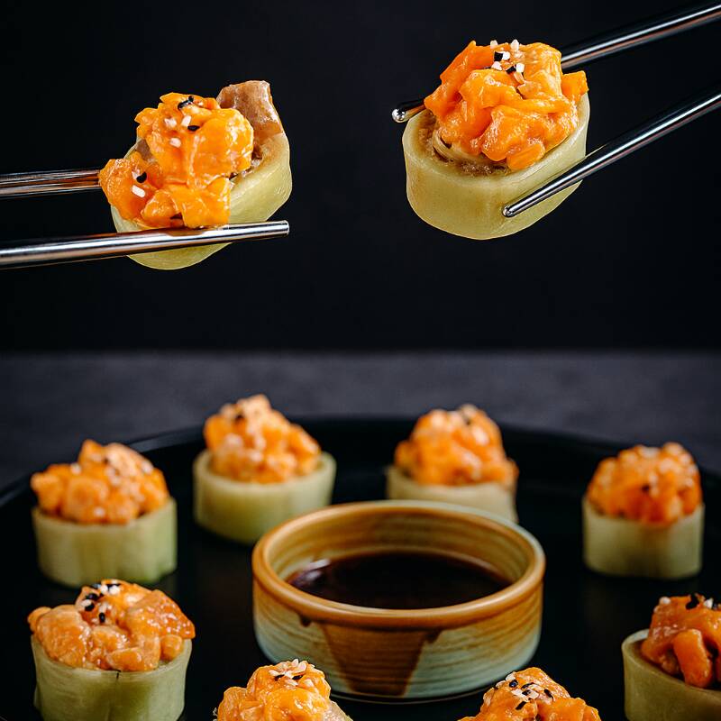 Atún, spicy kanikama, aguacate y espárrago tempura envuelto en hoja de pepino con topping de salmón spicy.