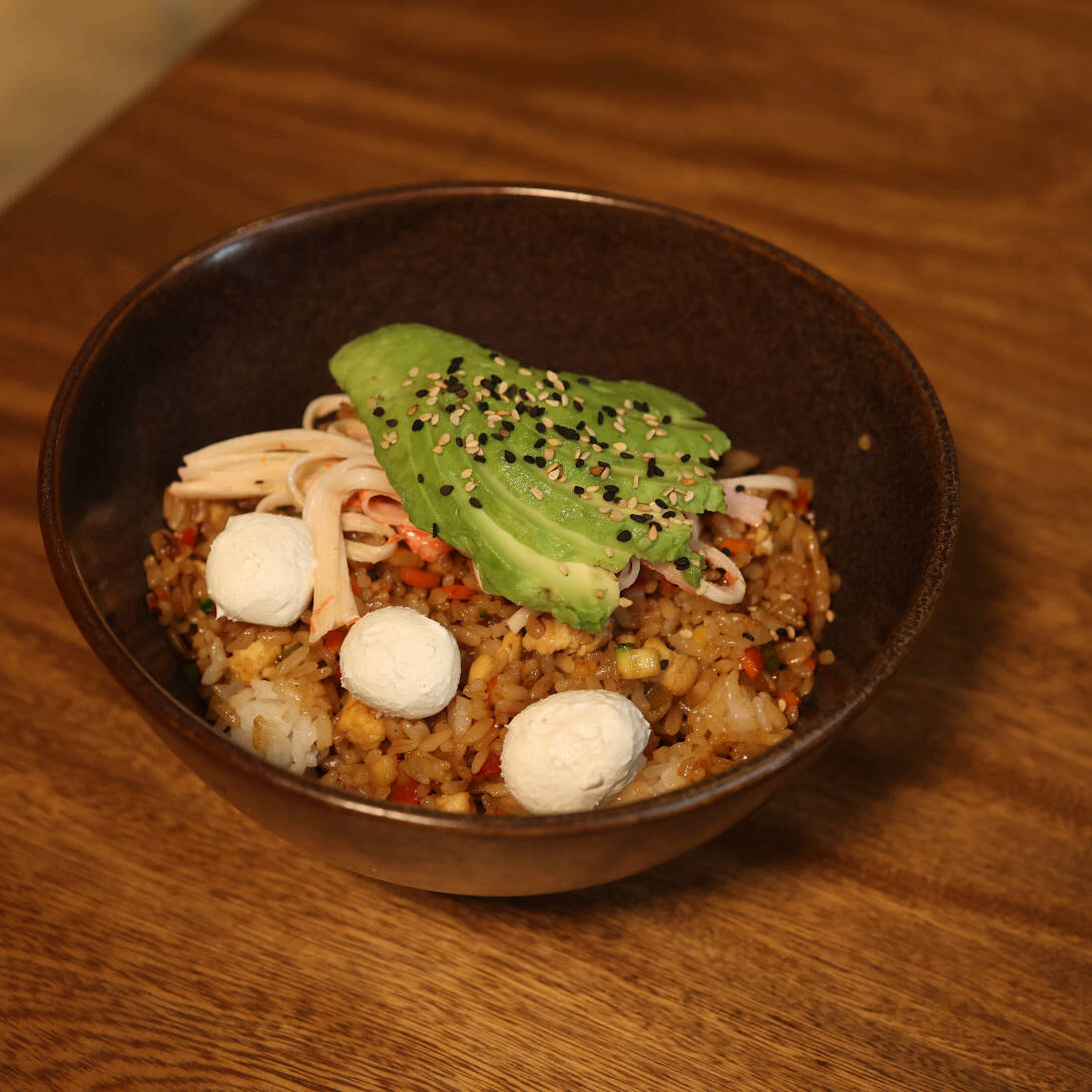 Arroz frito con zanahoria, calabaza, pimientos morrones, cebolla y soya, servido con queso crema, aguacate y spicy kanikama.