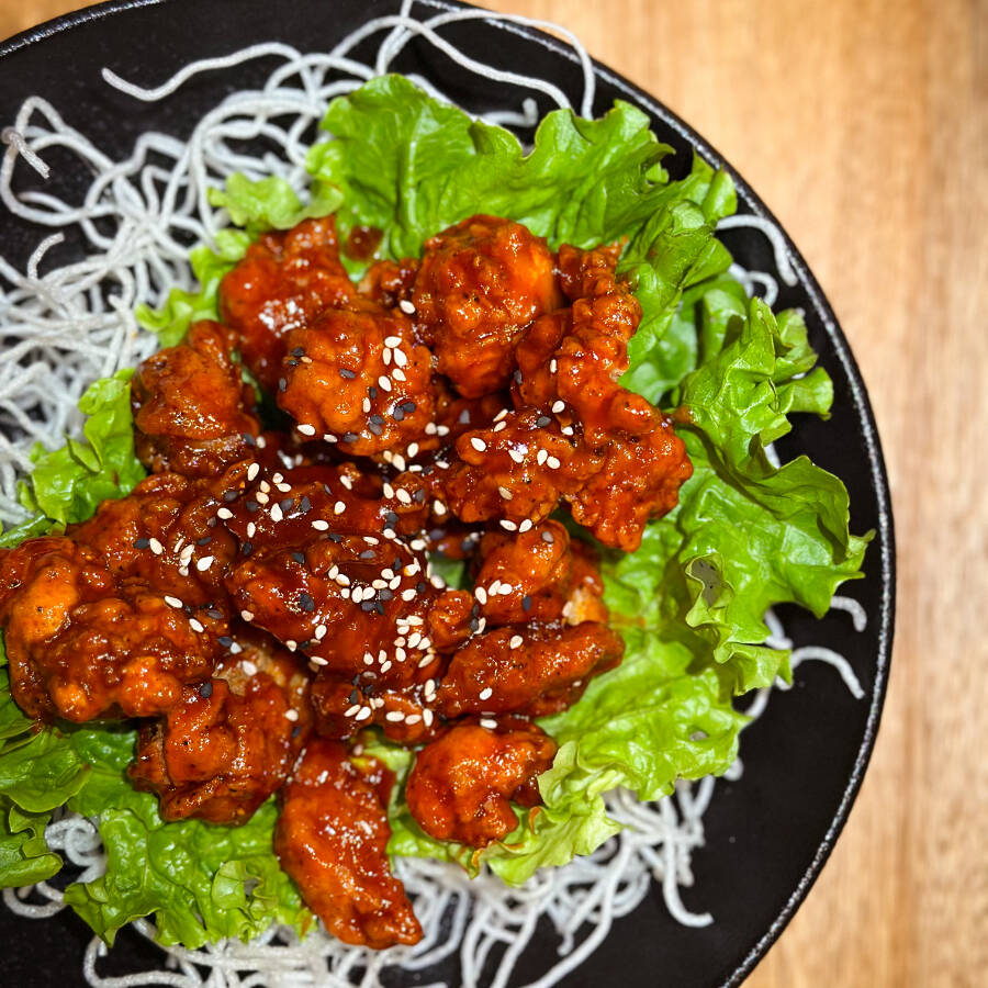Tiras de res salteadas al wok, pimientos, salsa oscura preparada con crema de cacahuate y nuestro chili oil casero con chapulines. Servido con arroz al vapor y un toque de ajo tostado.