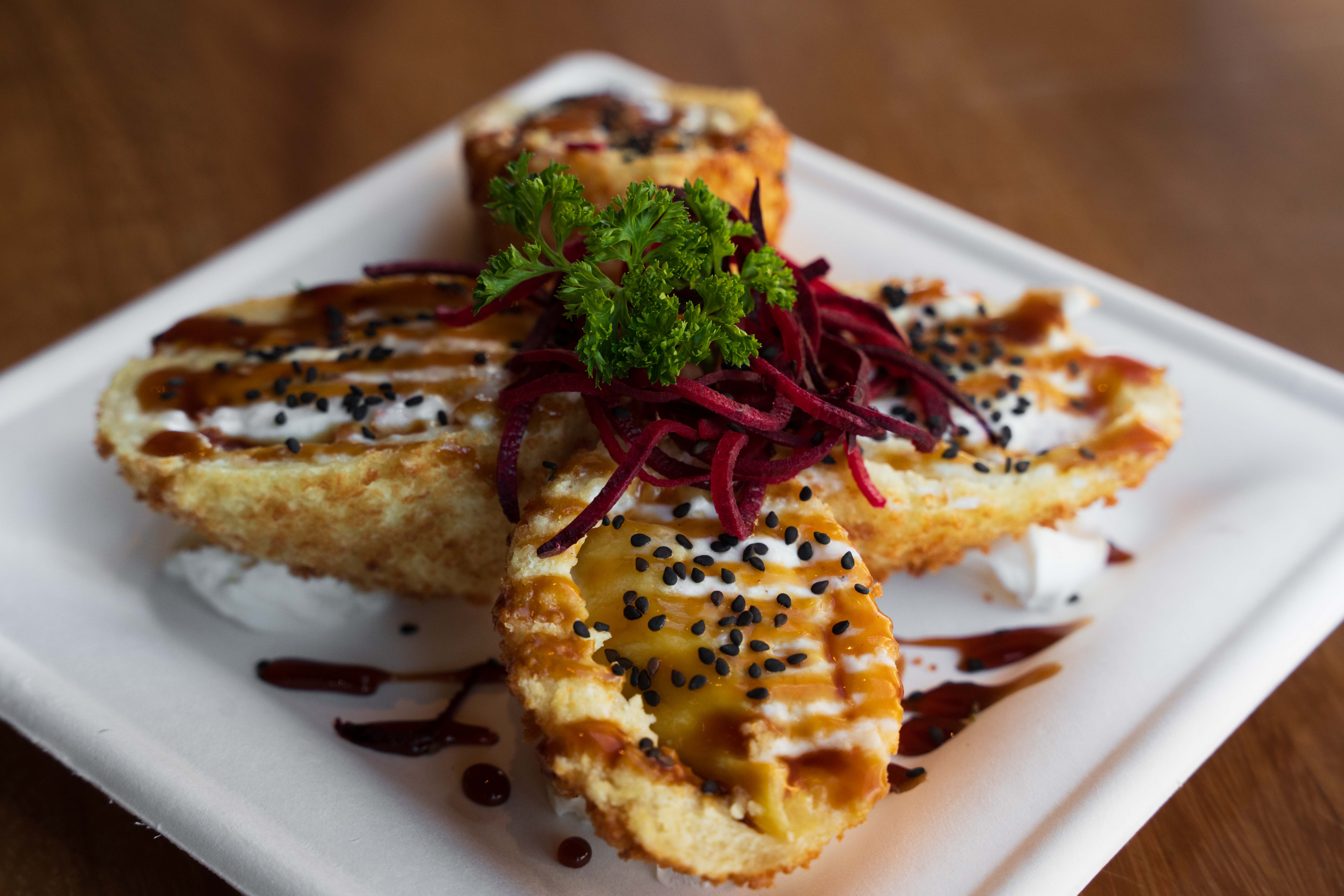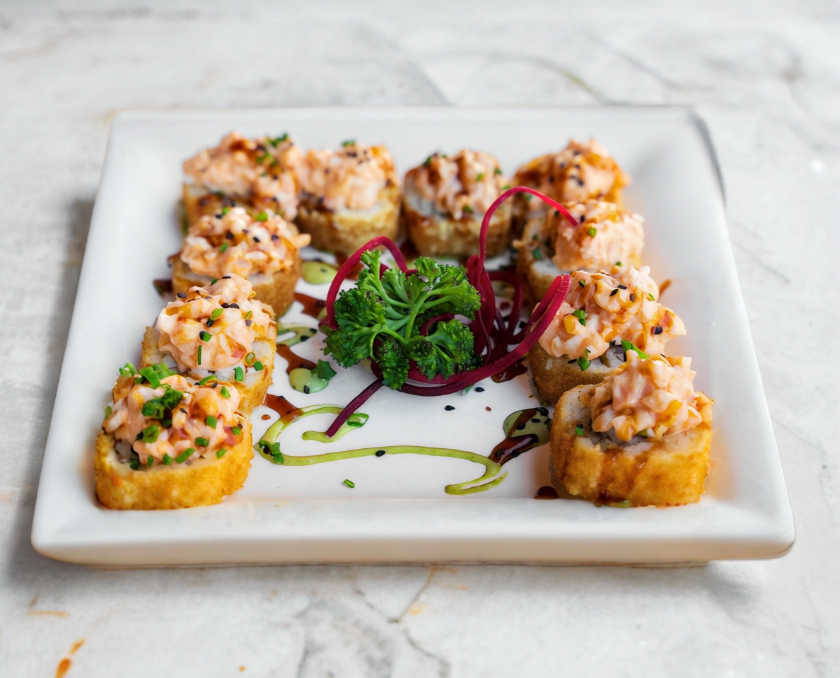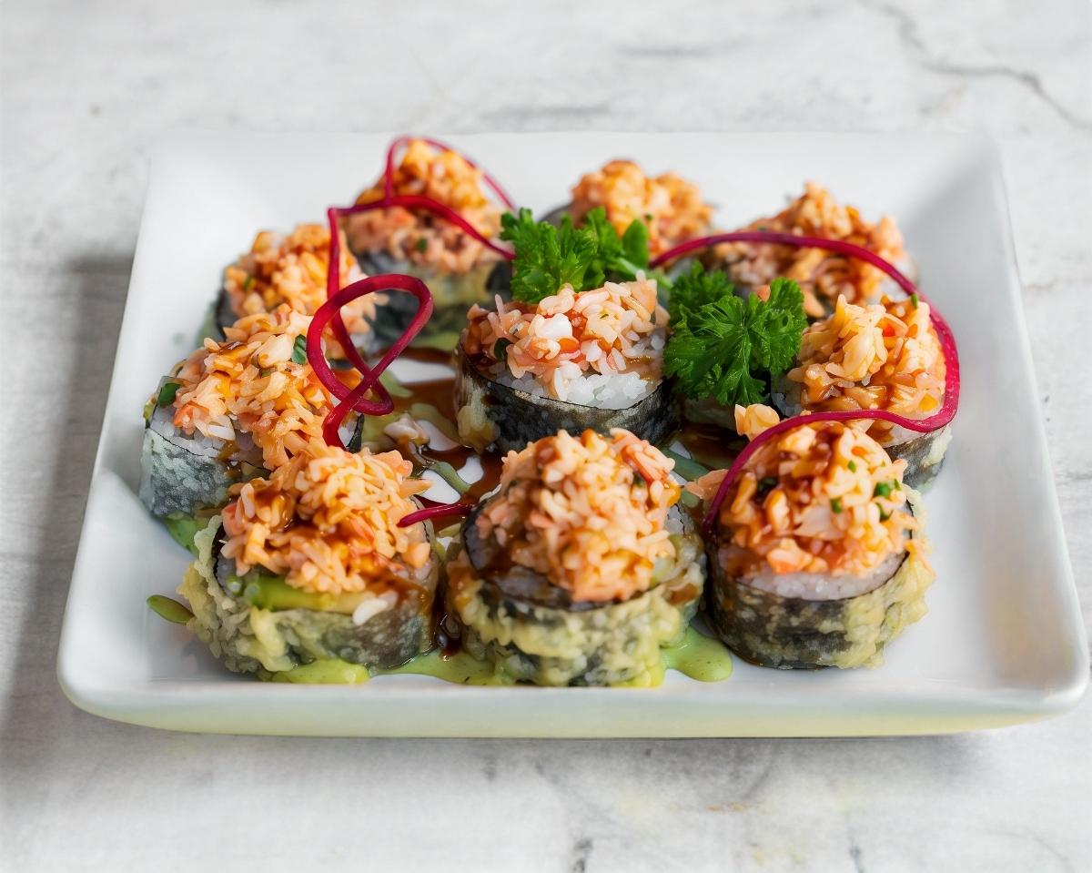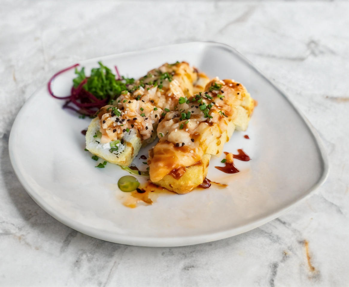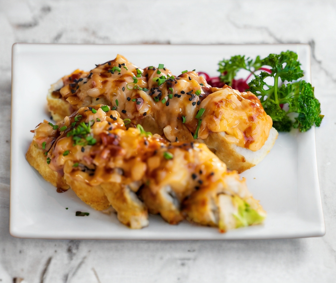 Rollo empanizado y horneado, aguacate, pepino, queso crema, topping de camarón spicy. Aderezo de anguila, cilantro y rayu.