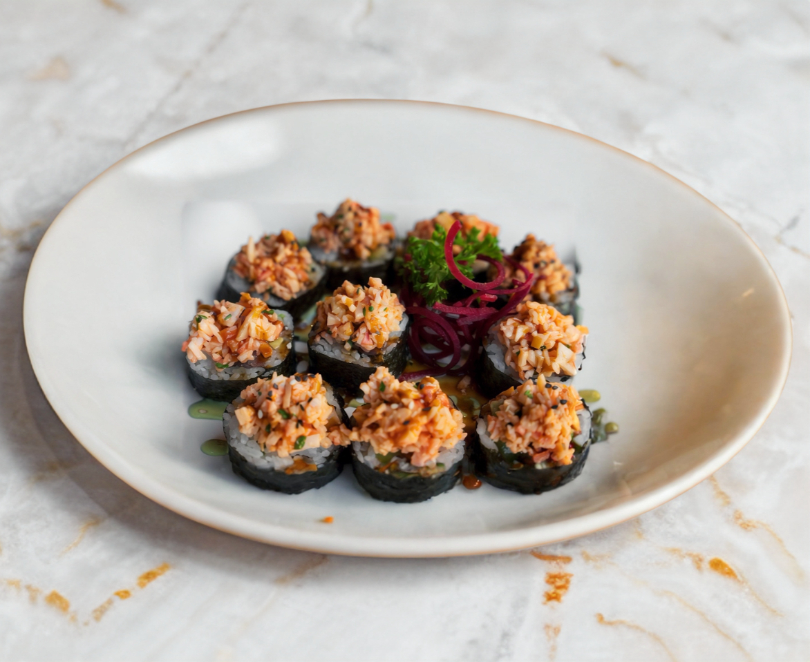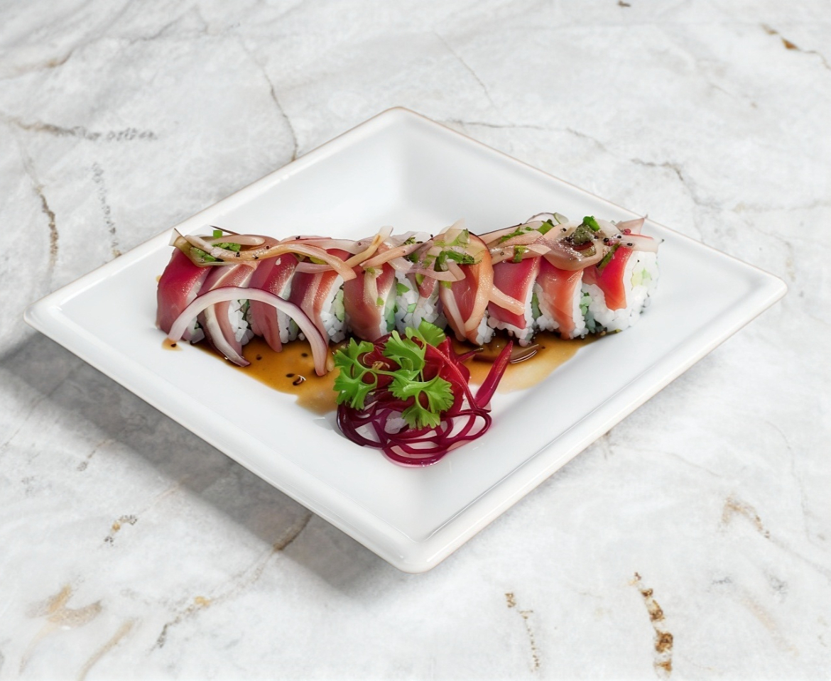 Alga nori, camarón, aguacate, pepino, cilantro, forrado de atún, topping de cebolla serrano y ponzu.