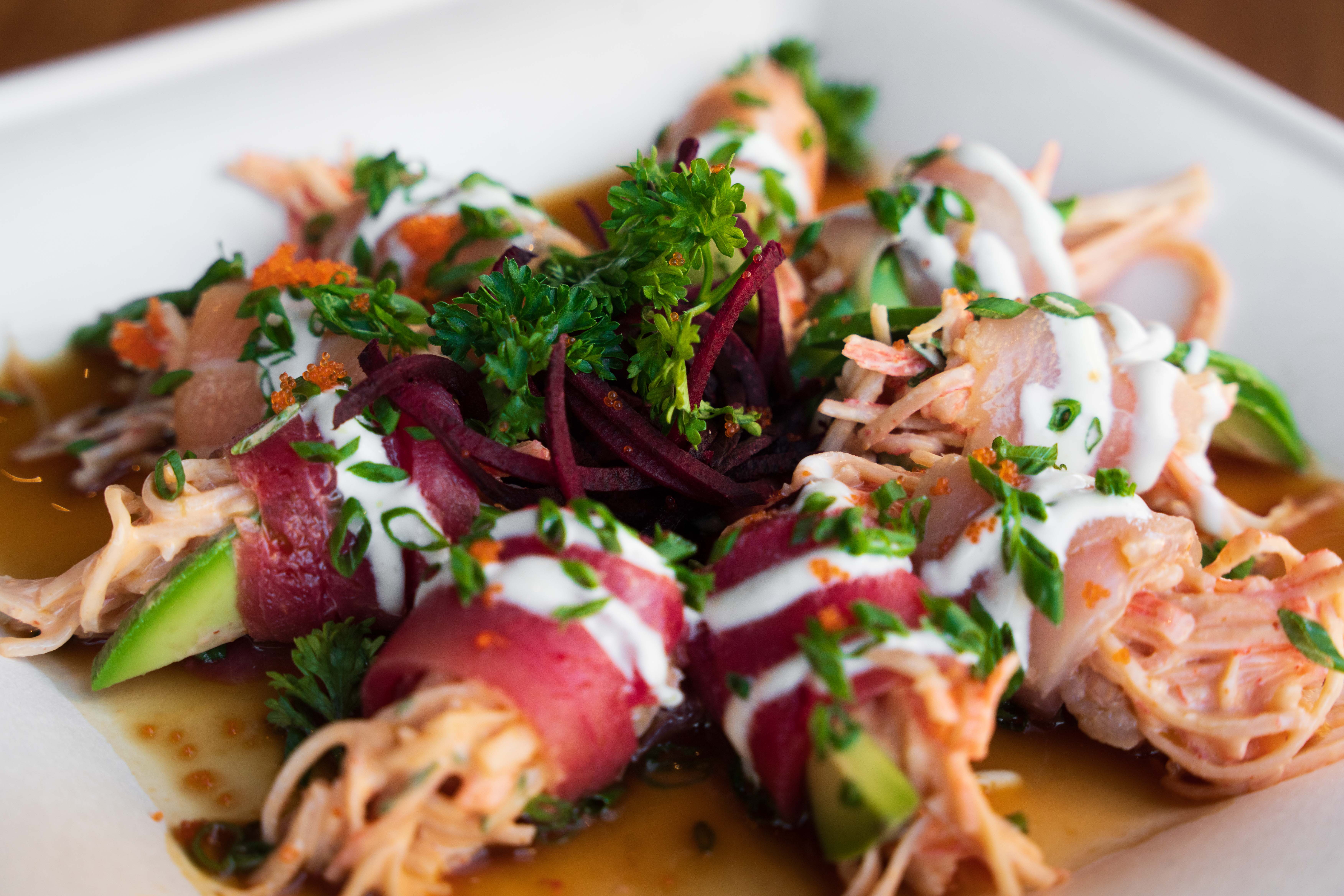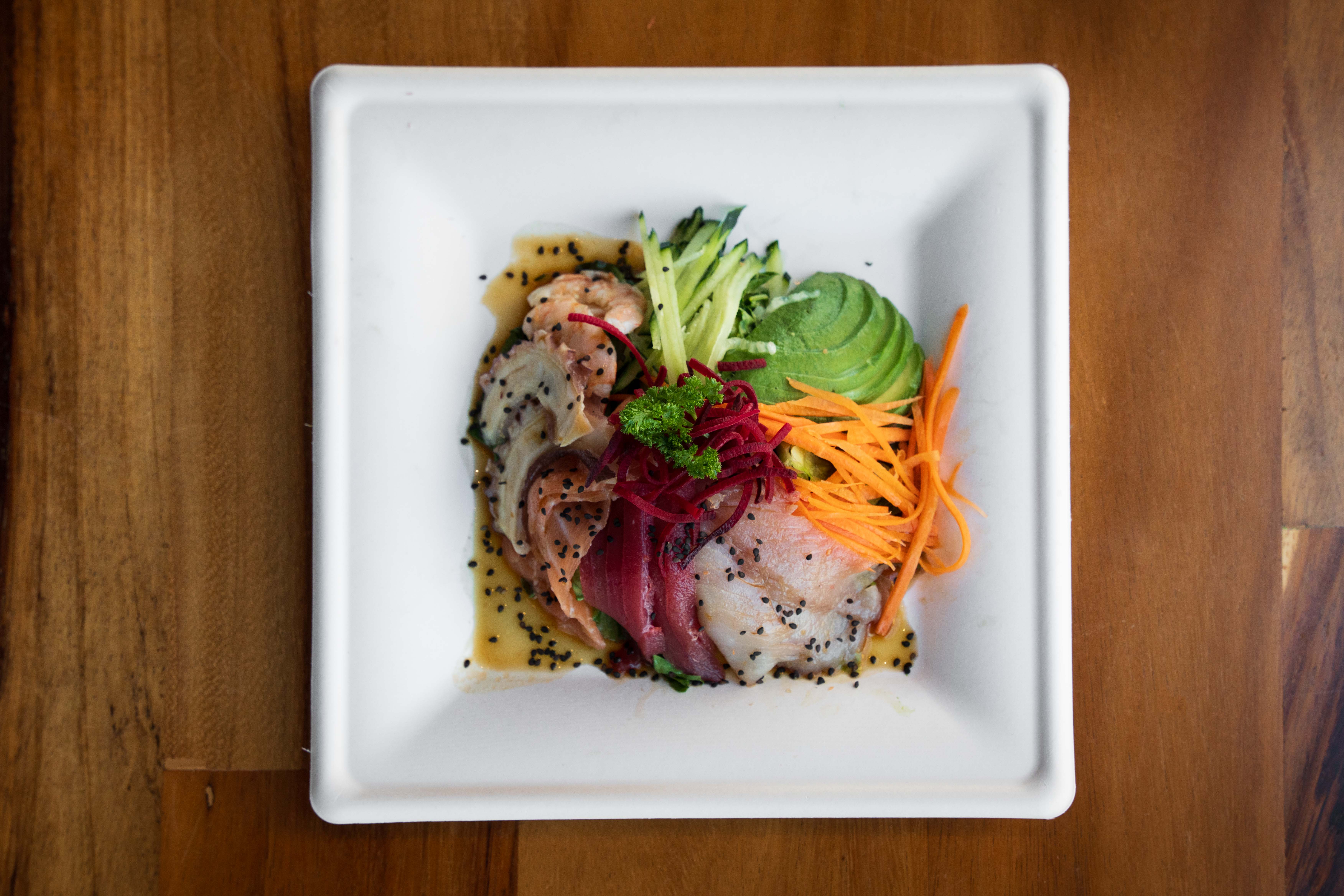 Mix de mariscos, lechuga, pepino, aguacate, zanahoria alfalfa, todo acompañado de ponzu y aderezo de ajonjolí.