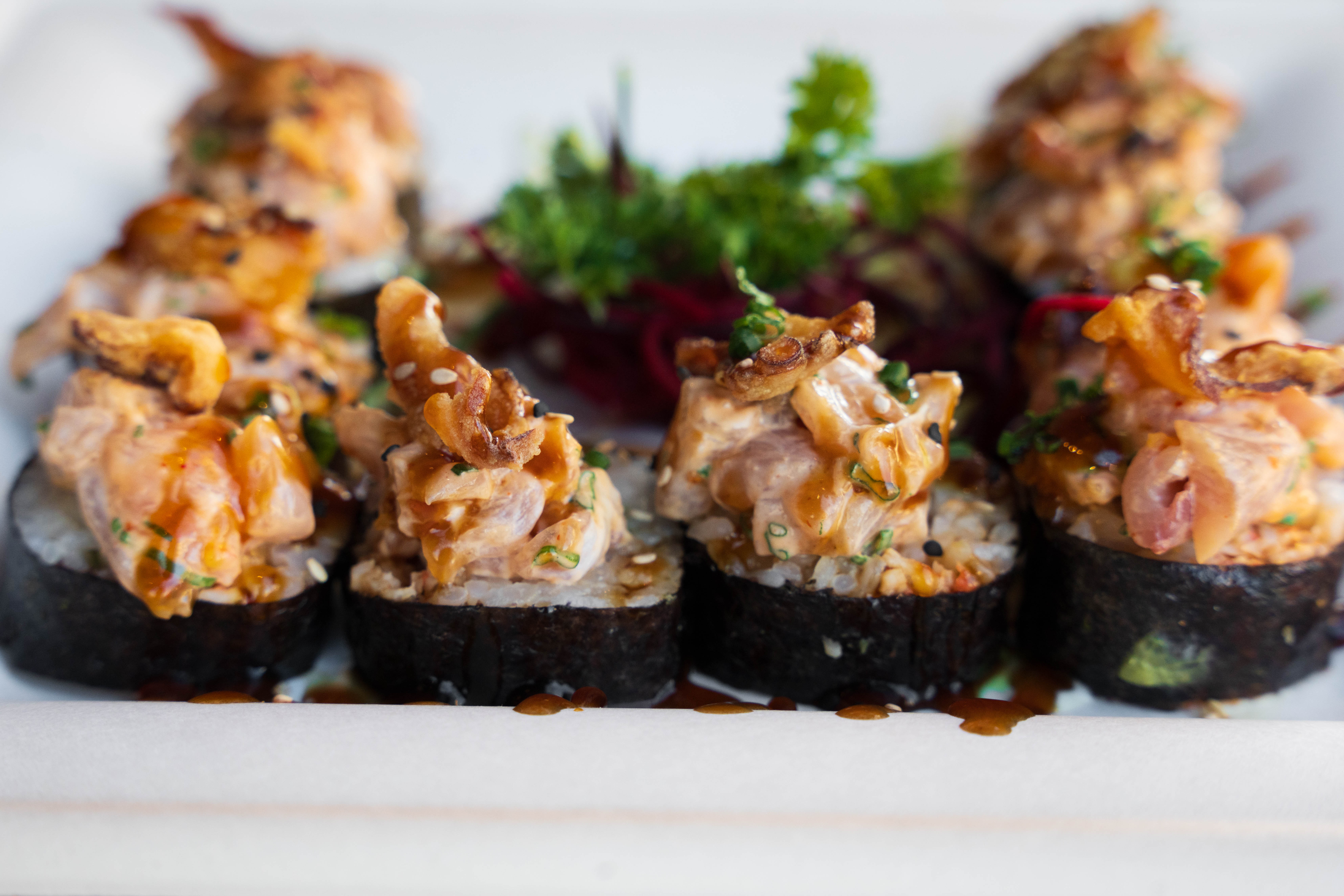 Láminas de pescado, atún, salmón, jurel, rellenos de aguacate, kanikama spicy, masago, cebollín, salsa yuzu y ponzu.