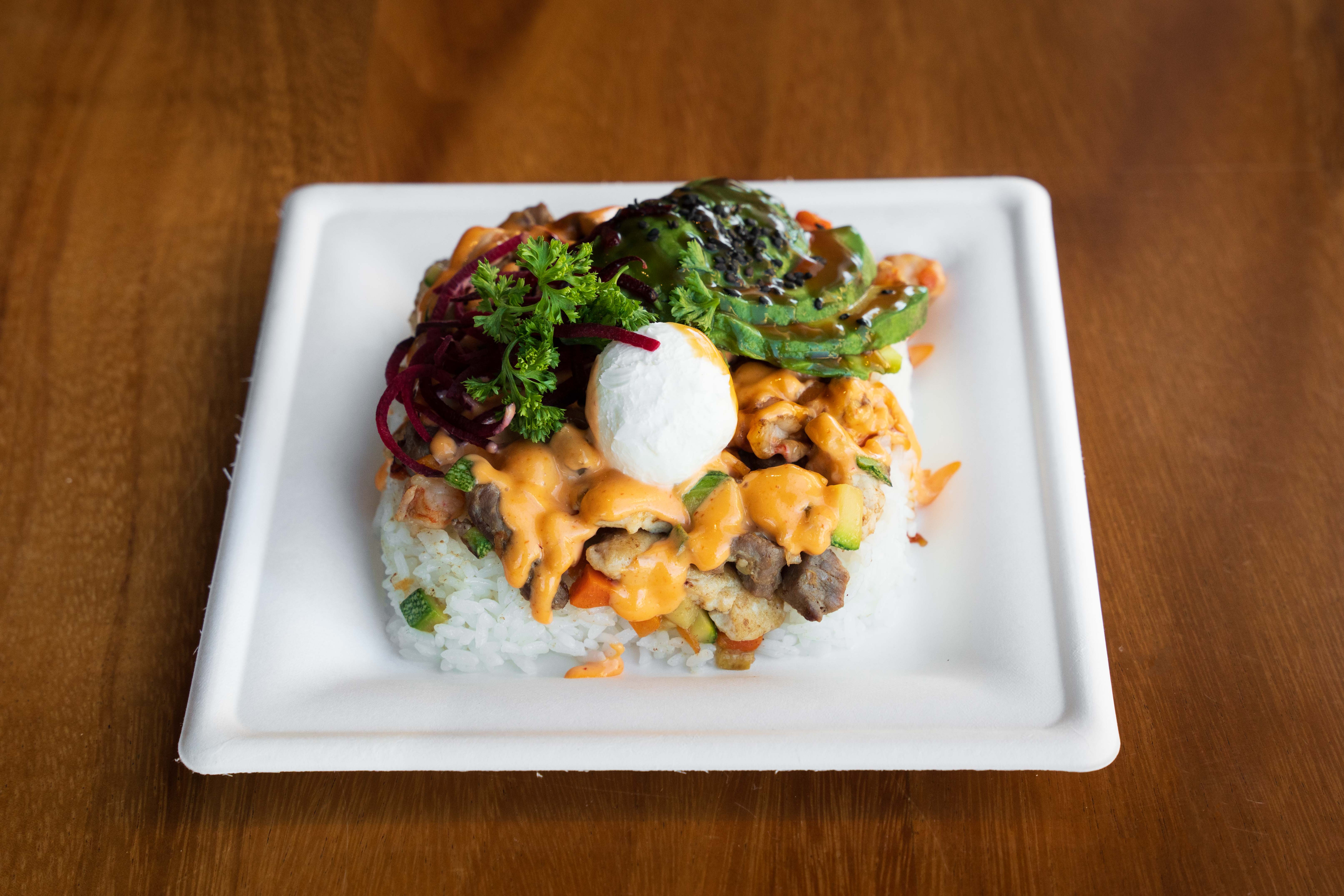 Arrachera, pollo, camarón, pimientos, cebolla, vegetales mix, aguacate, arroz y salsa de teriyaki.
