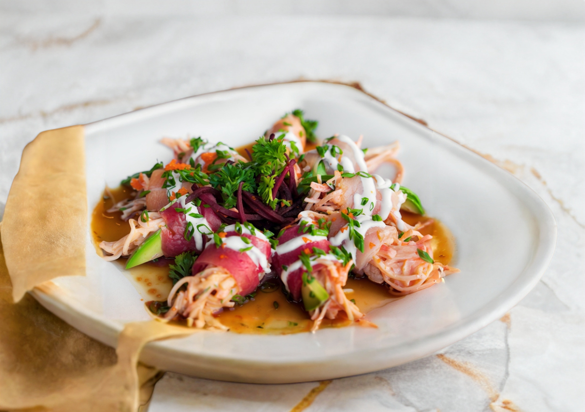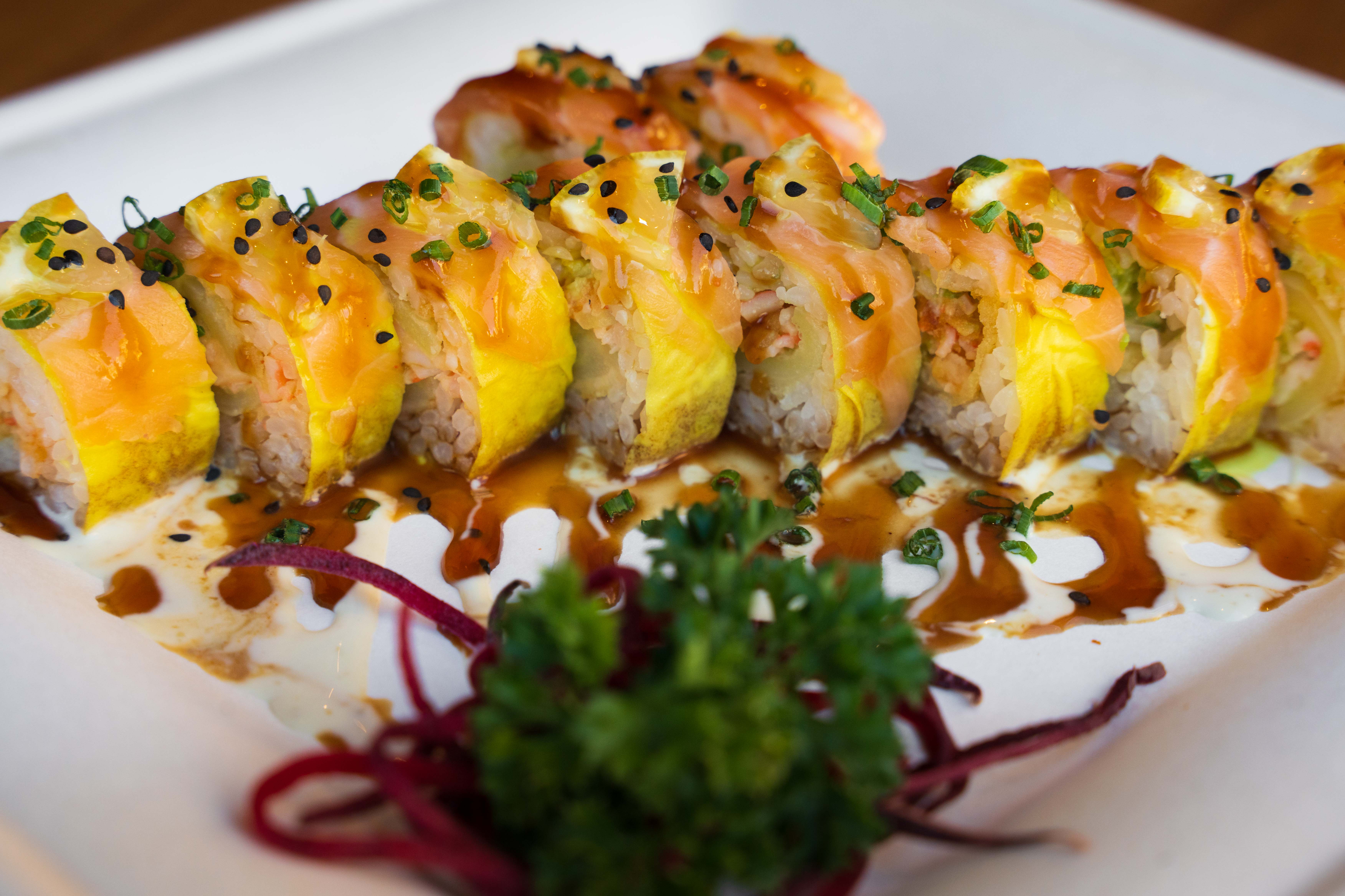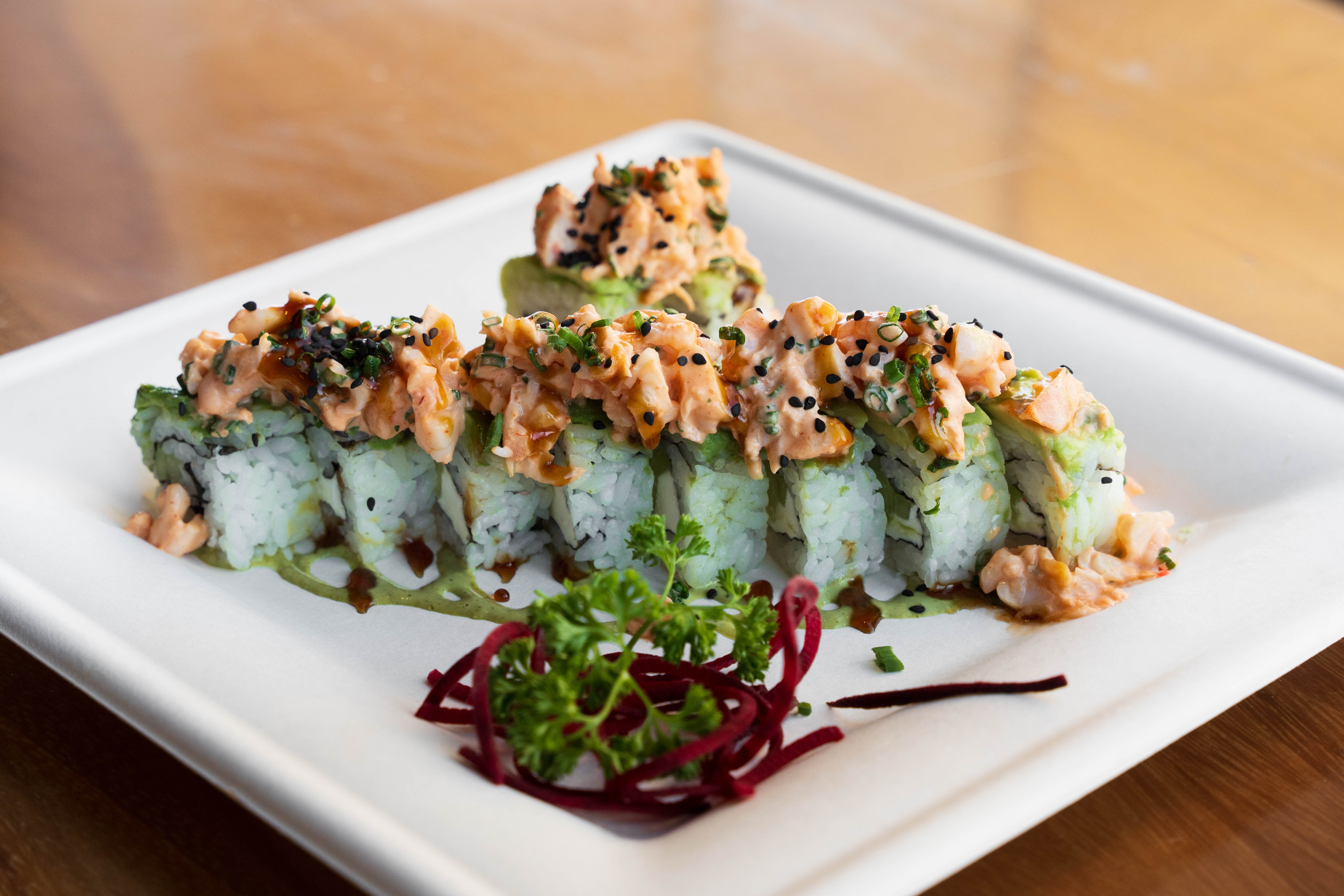 Envuelto de hoja de soya, kanikama spicy, chilito güero, aguacate, forrado de salmón, láminas de limón amarillo, ponzu y aceite de curry.