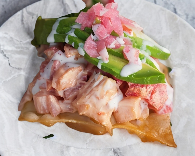 Atún marinado en spicy, montado sobre tostadas wontón, aguacate, cebolla curtida, salsa ponzu (3 pzs).