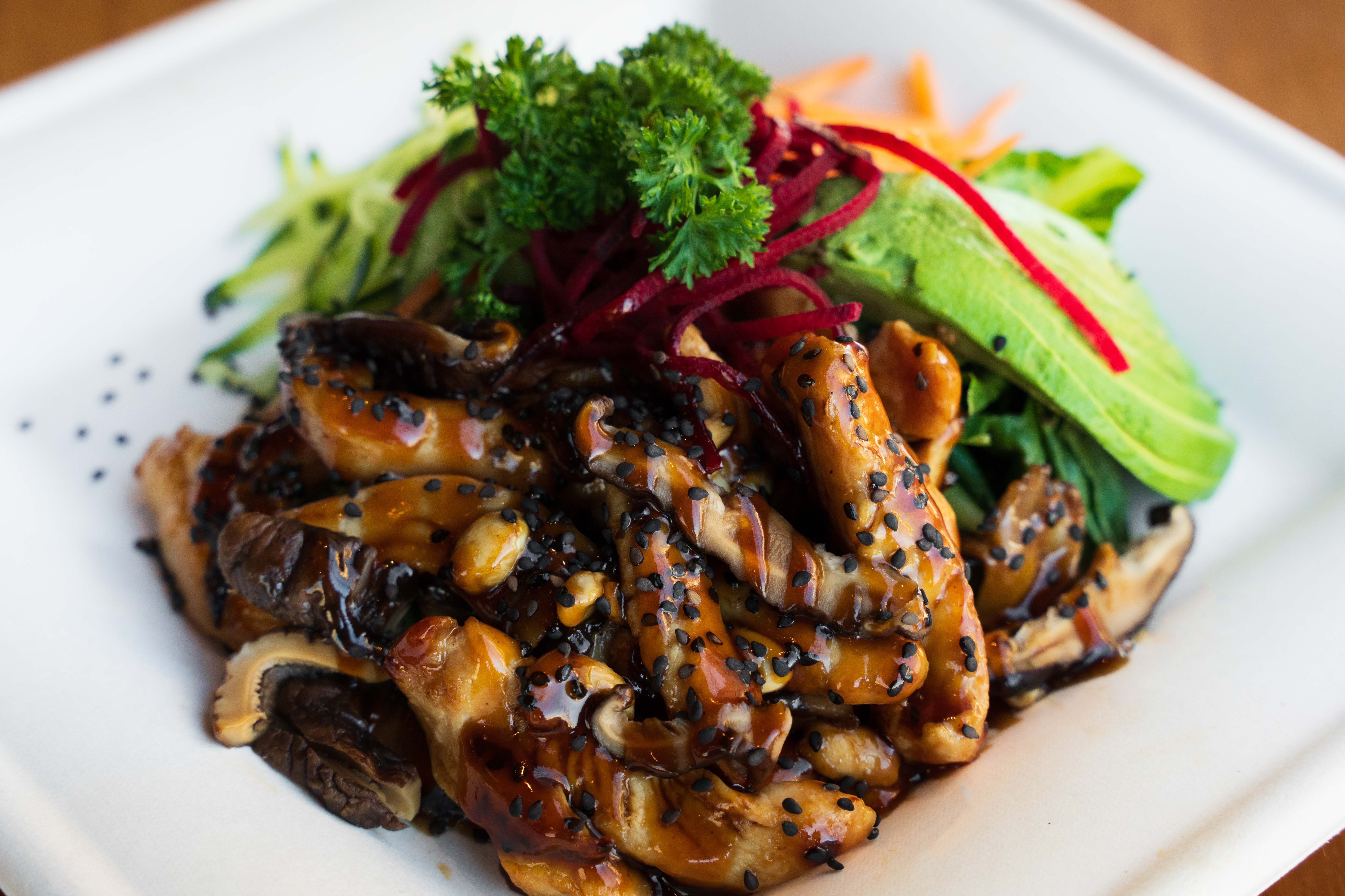 Lechuga mix, aguacate, pepino, zanahoria, champiñones, cacahuate, pollo teriyaki y tomate cherry.