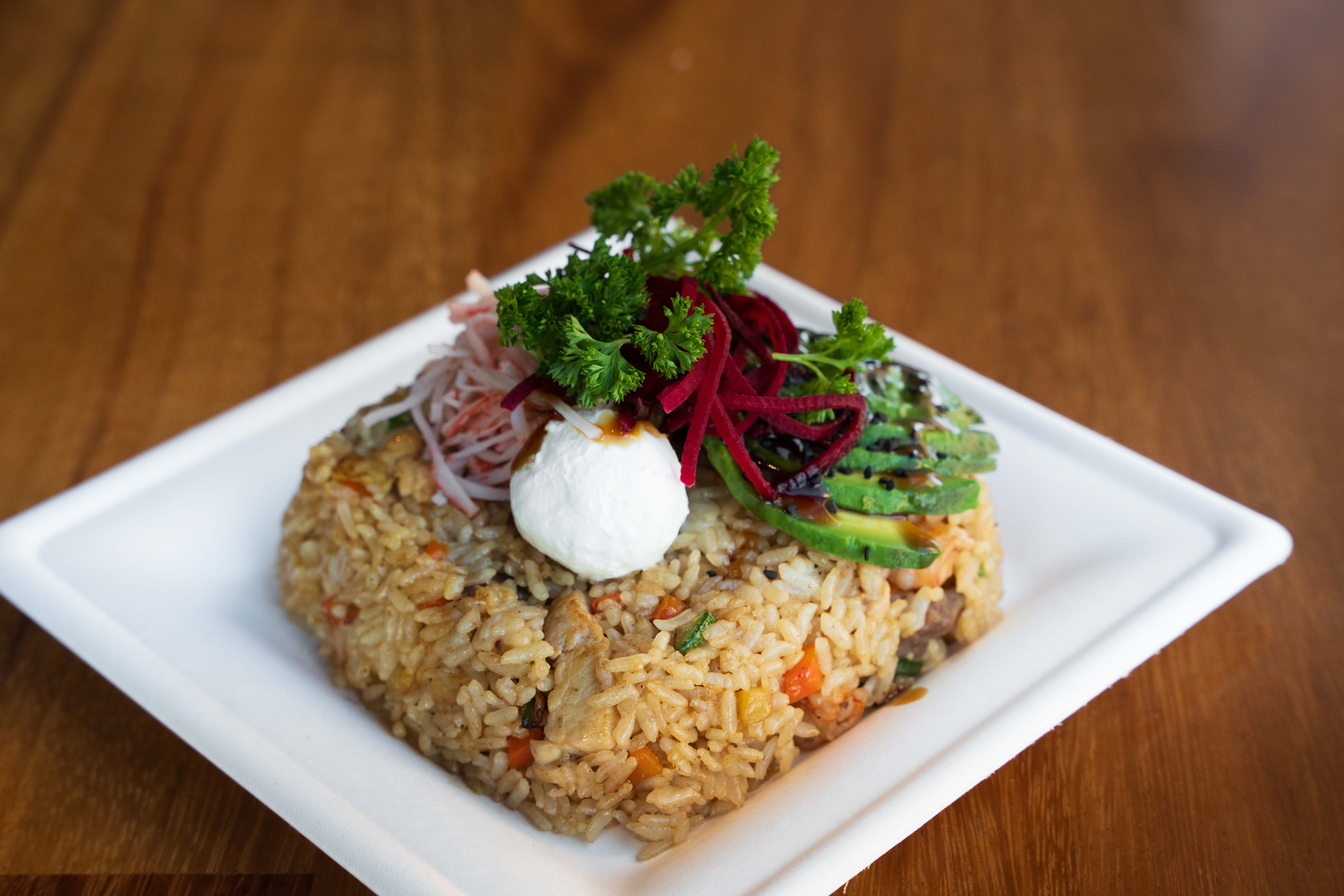 Arroz frito, verduras y aguacate.
