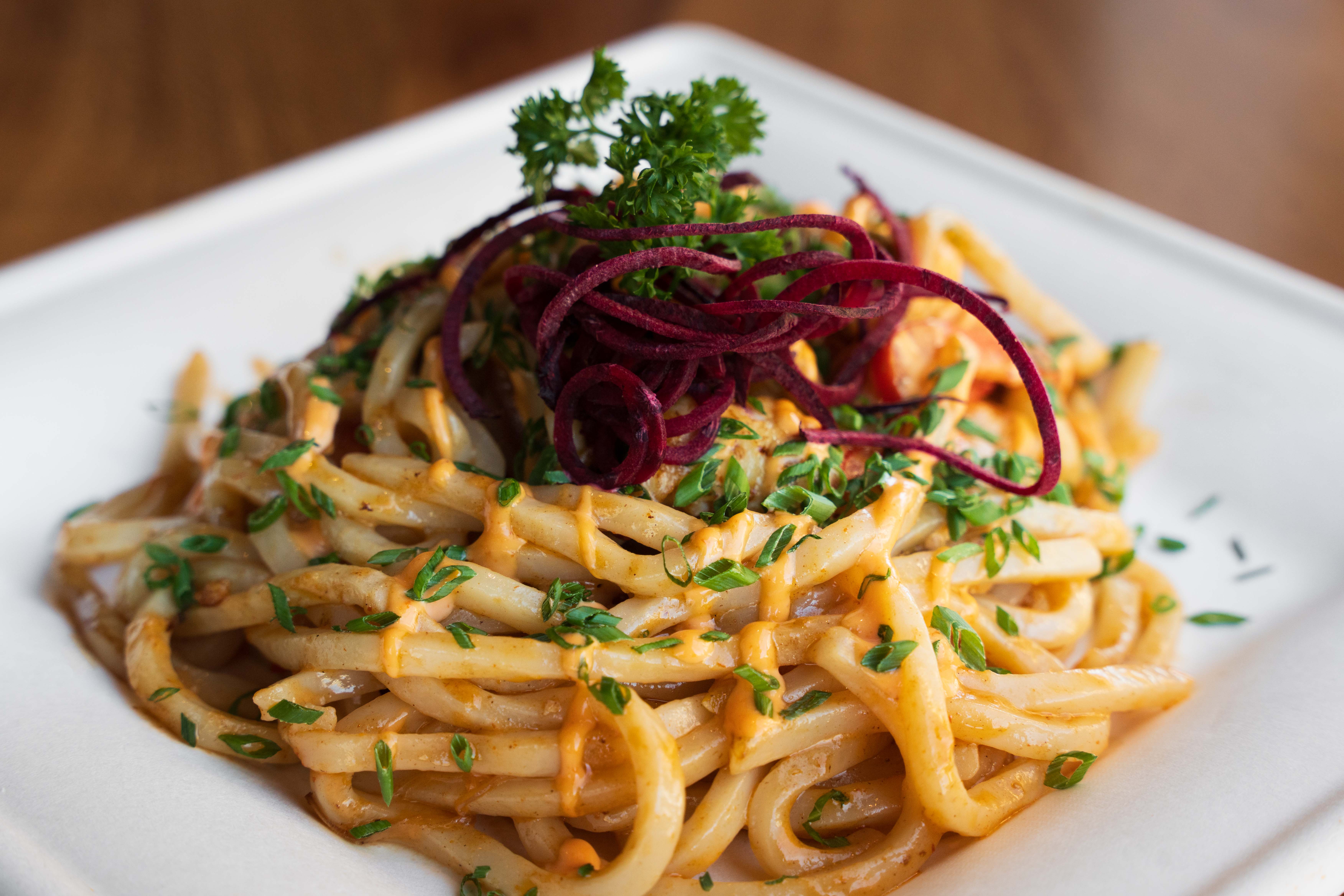 Udon, arrachera, pollo, camarón, cebolla, pimientos, salsa spicy y siracha.