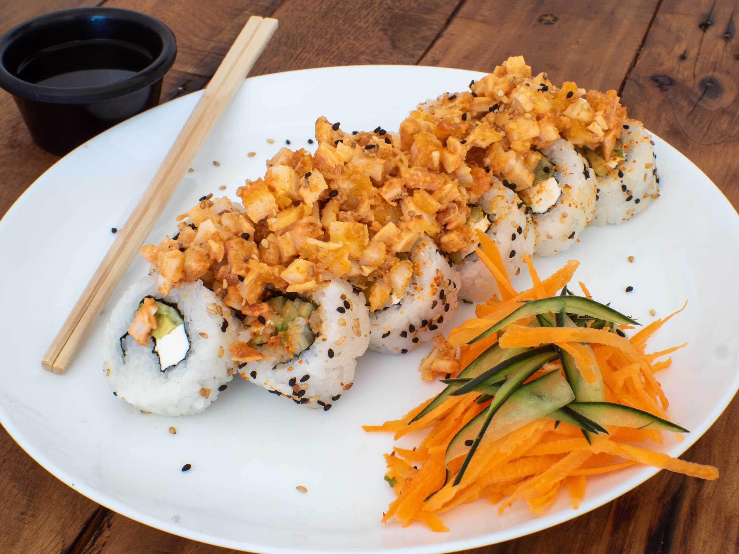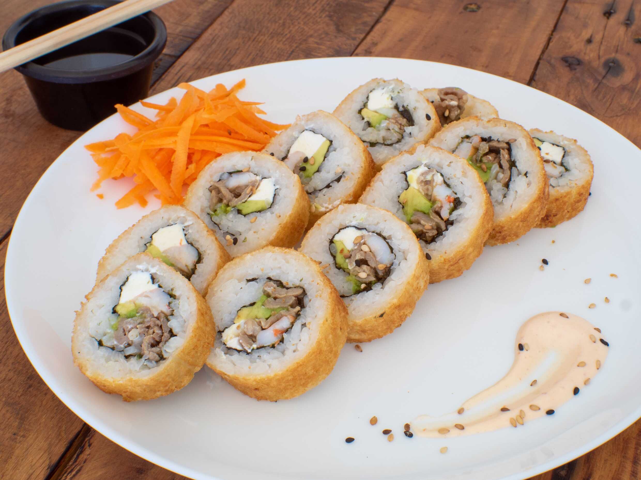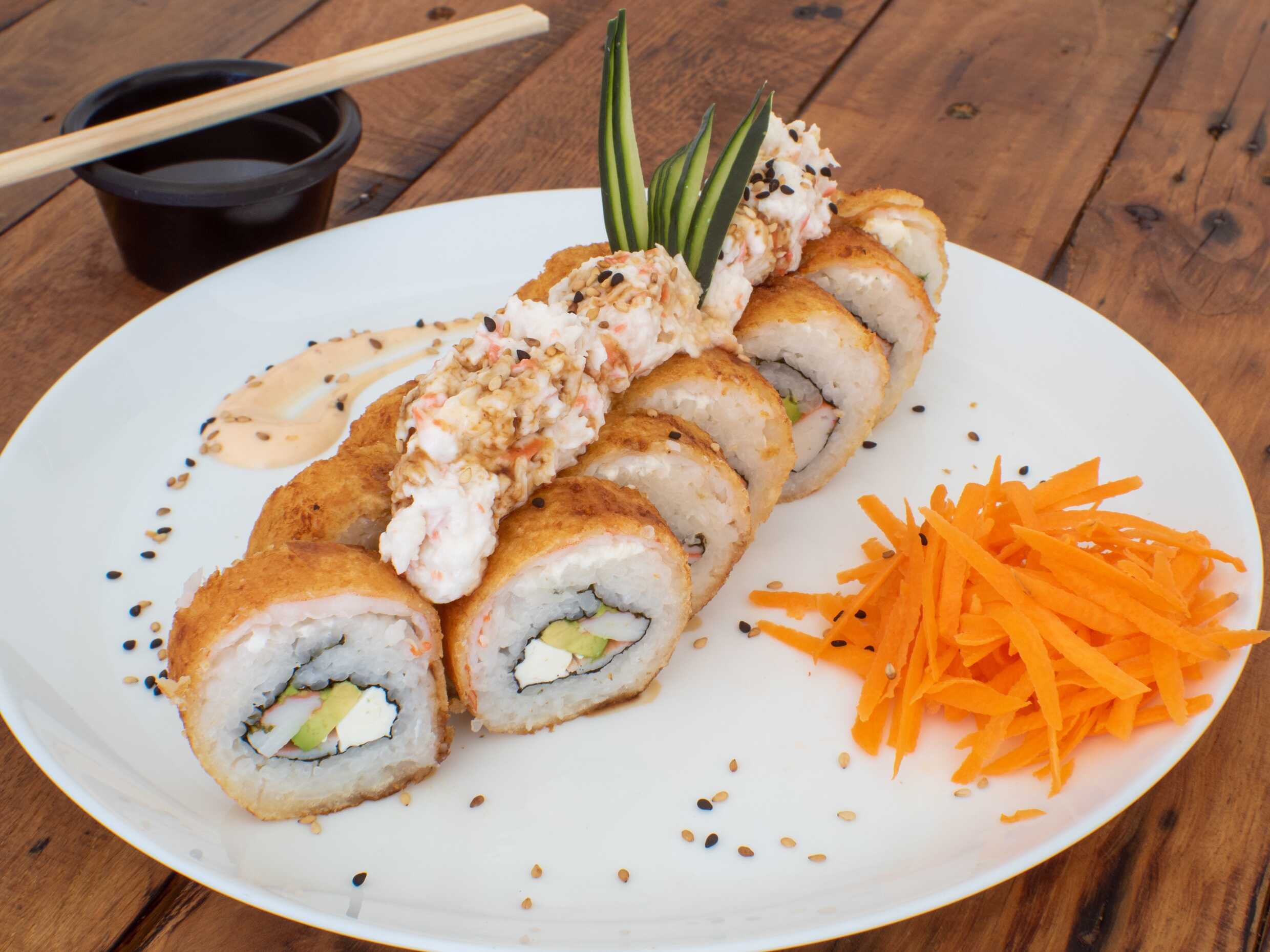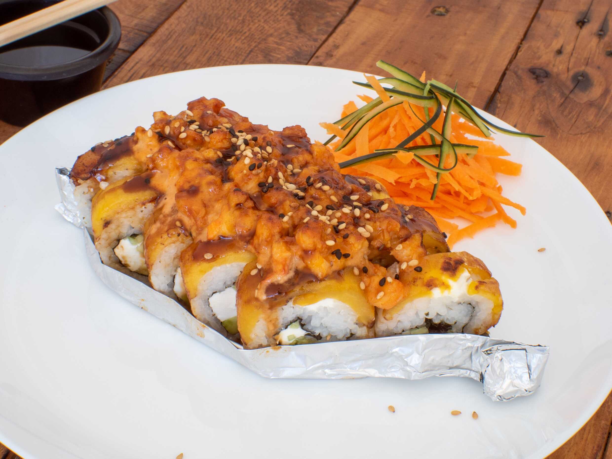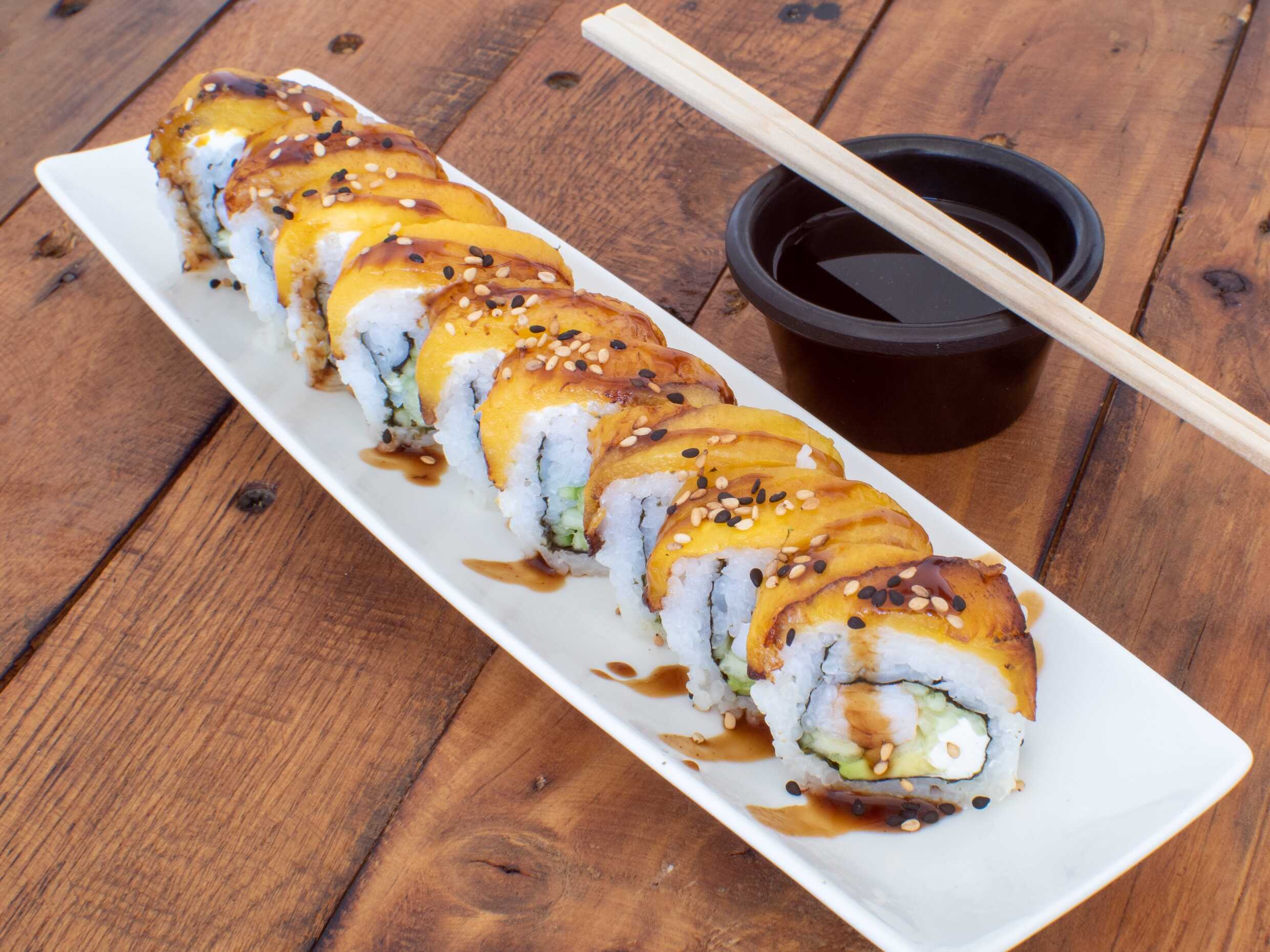 Zanahoria calabaza, camarón, aguacate, queso crema, tampico, bañado en salsa de anguila.