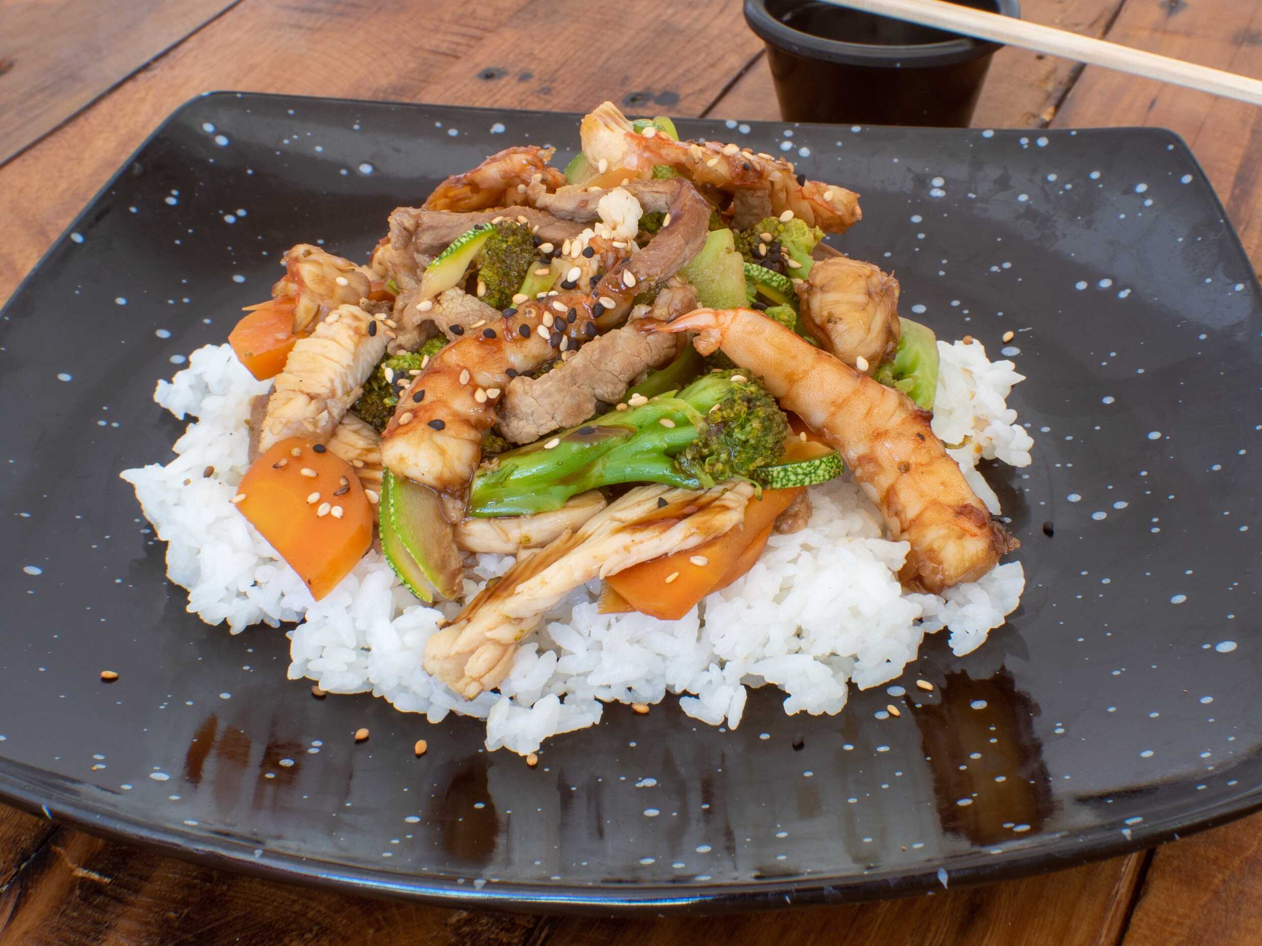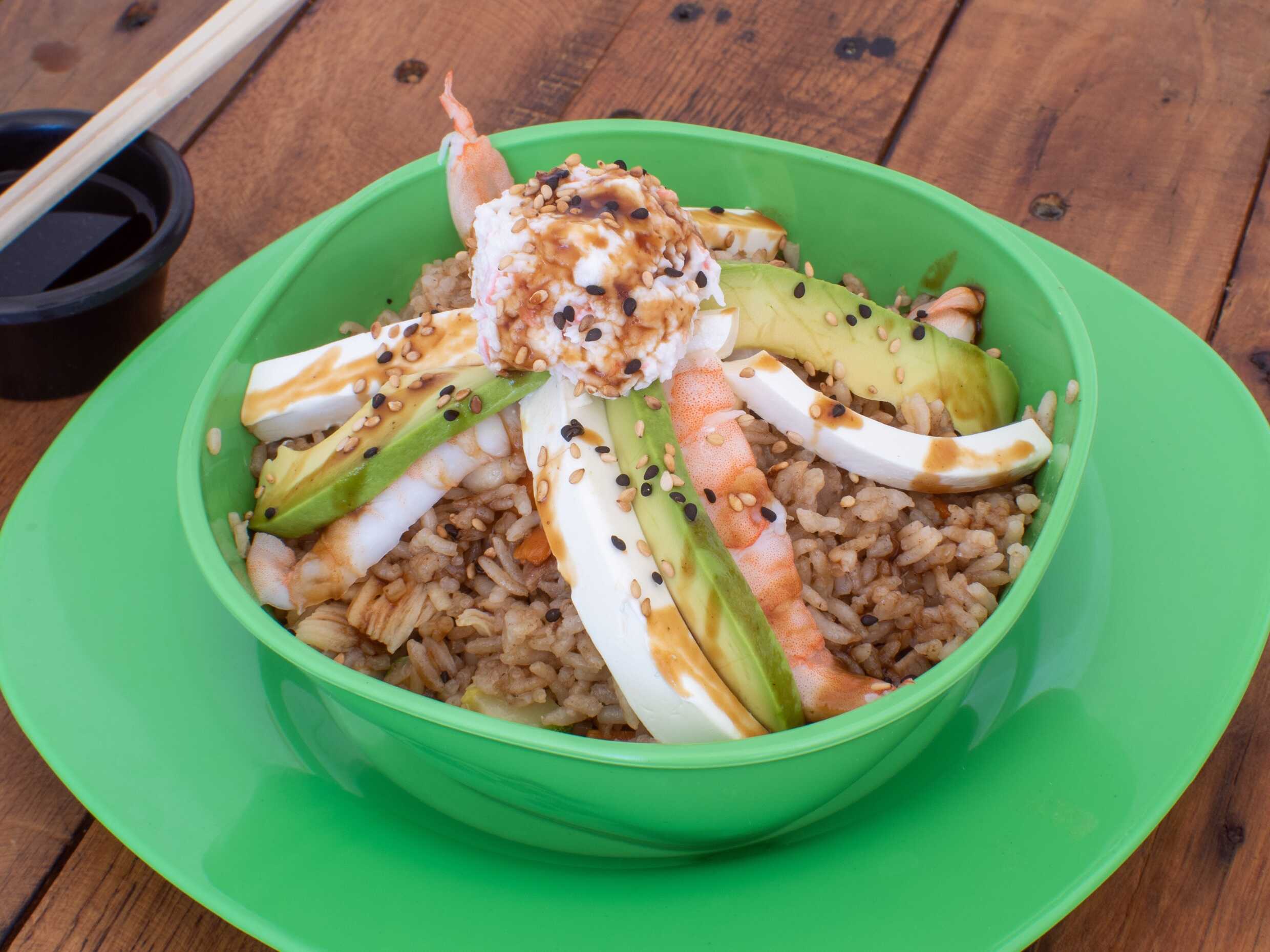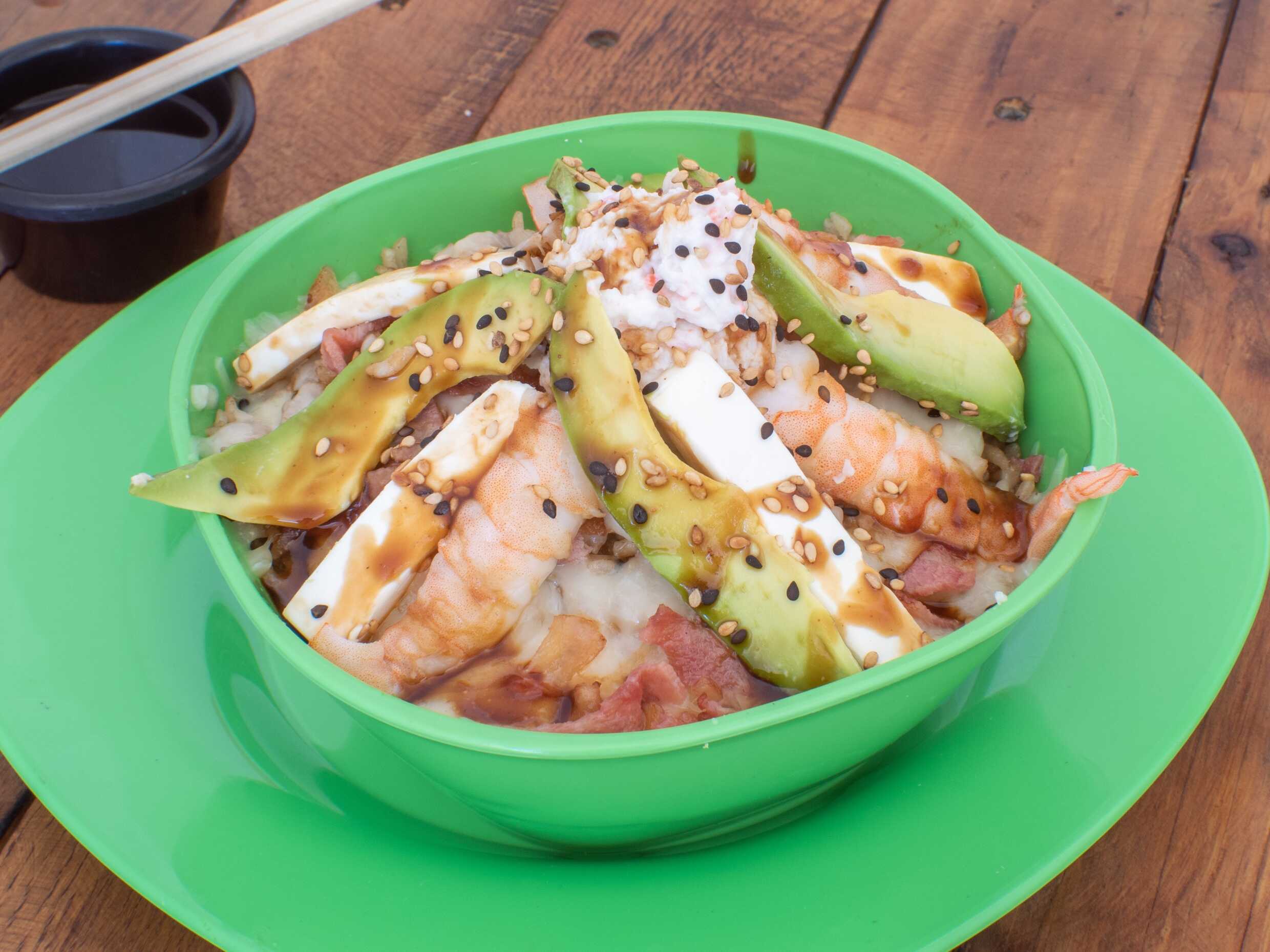 Arroz frito con zanahoria, calabaza, res, pollo, camarón, tocino, queso mozzarella, queso crema, aguacate, Tampico, bañado en salsa de anguila.