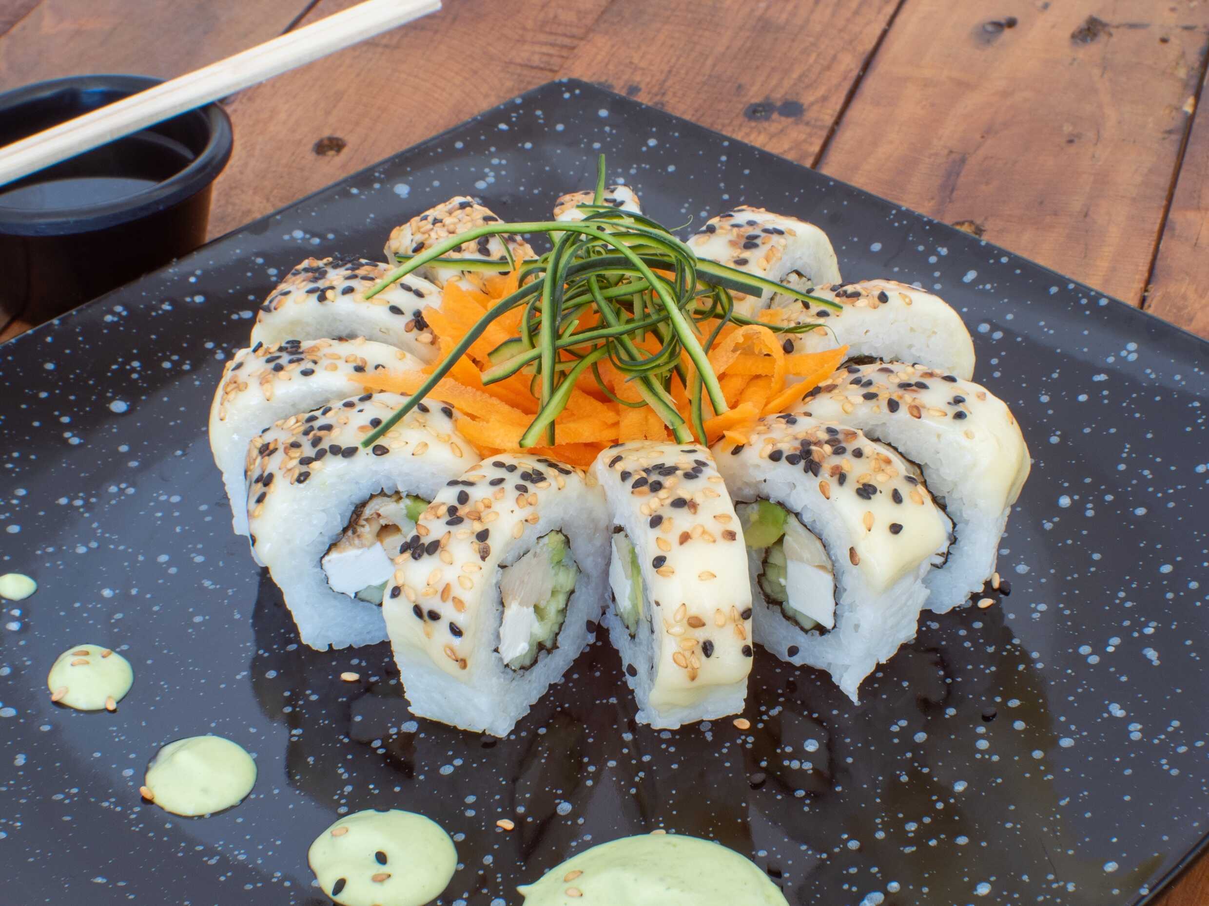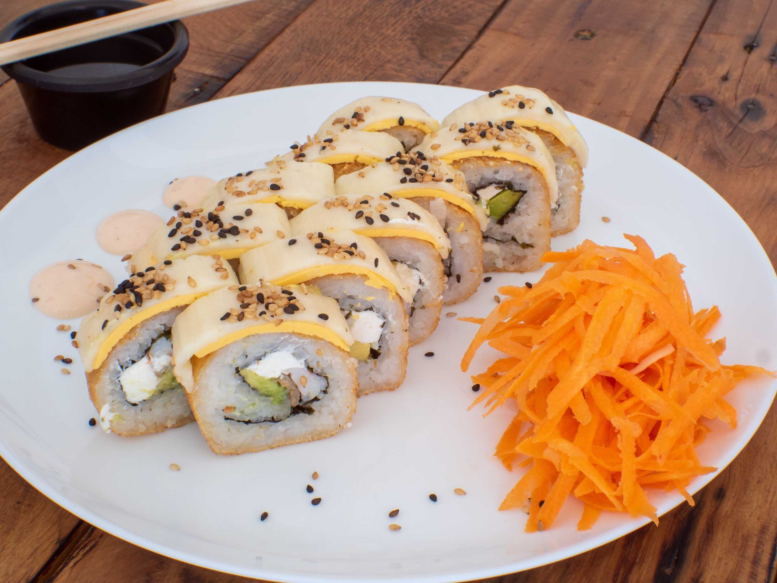 Queso crema, aguacate, pepino, pollo, cubierto de queso mozzarella y ajonjolí.
