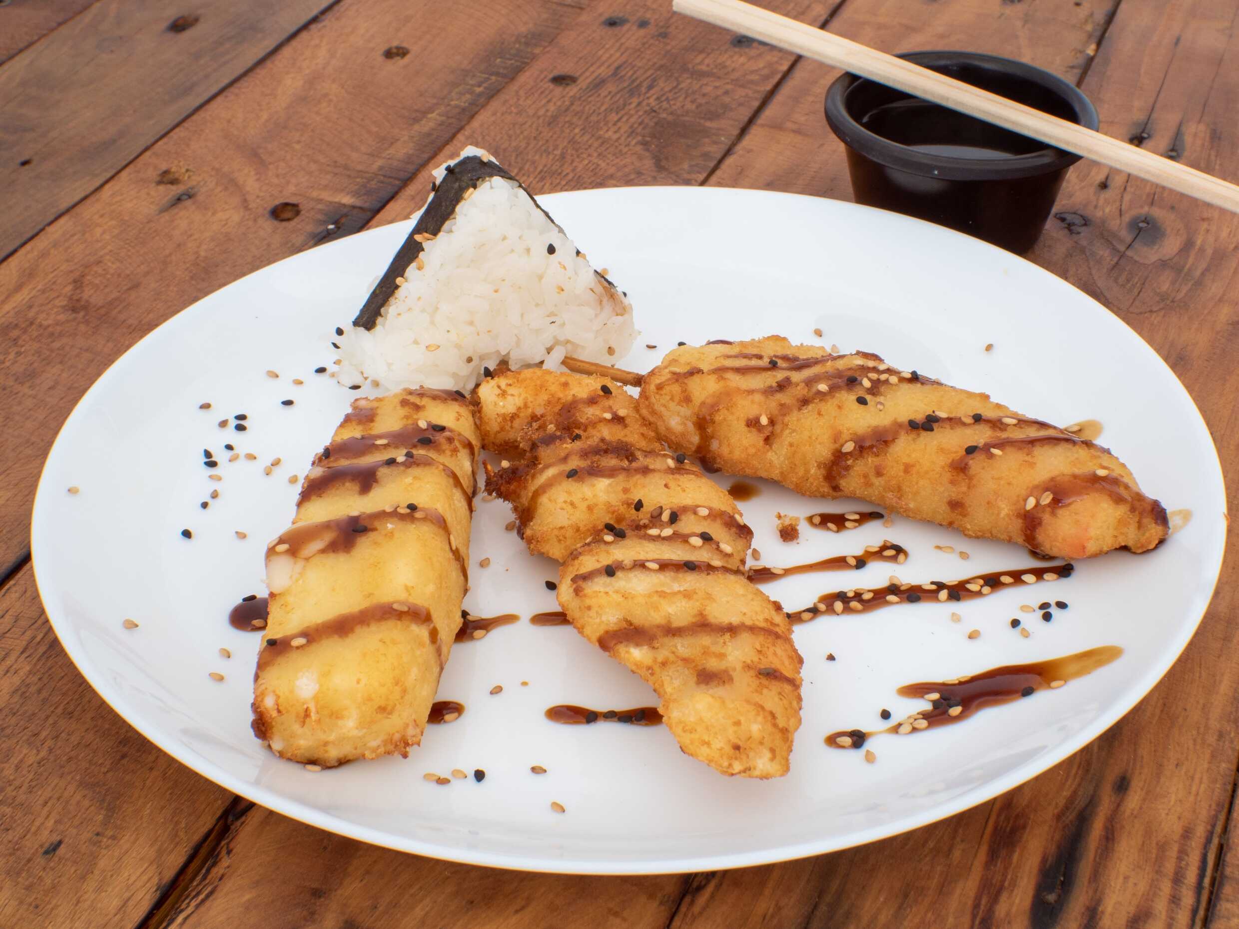 Deliciosas brochetas empanizadas, bañadas en salsa de anguila, acompañadas con arroz blanco y ajonjolí tostado (3 piezas).