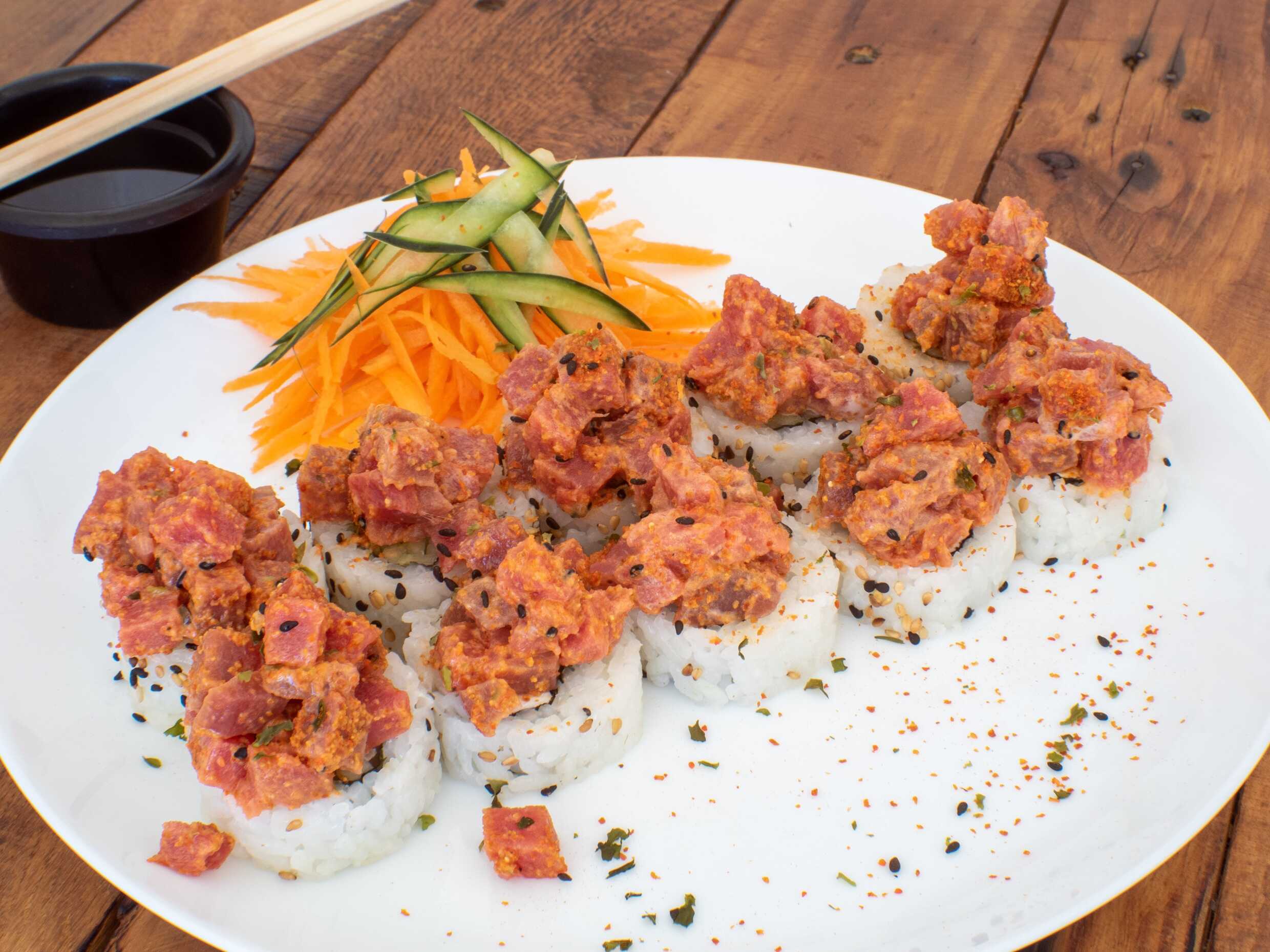 Queso crema, aguacate, pepino, cubierto de atún, con topping spicy de camarón.