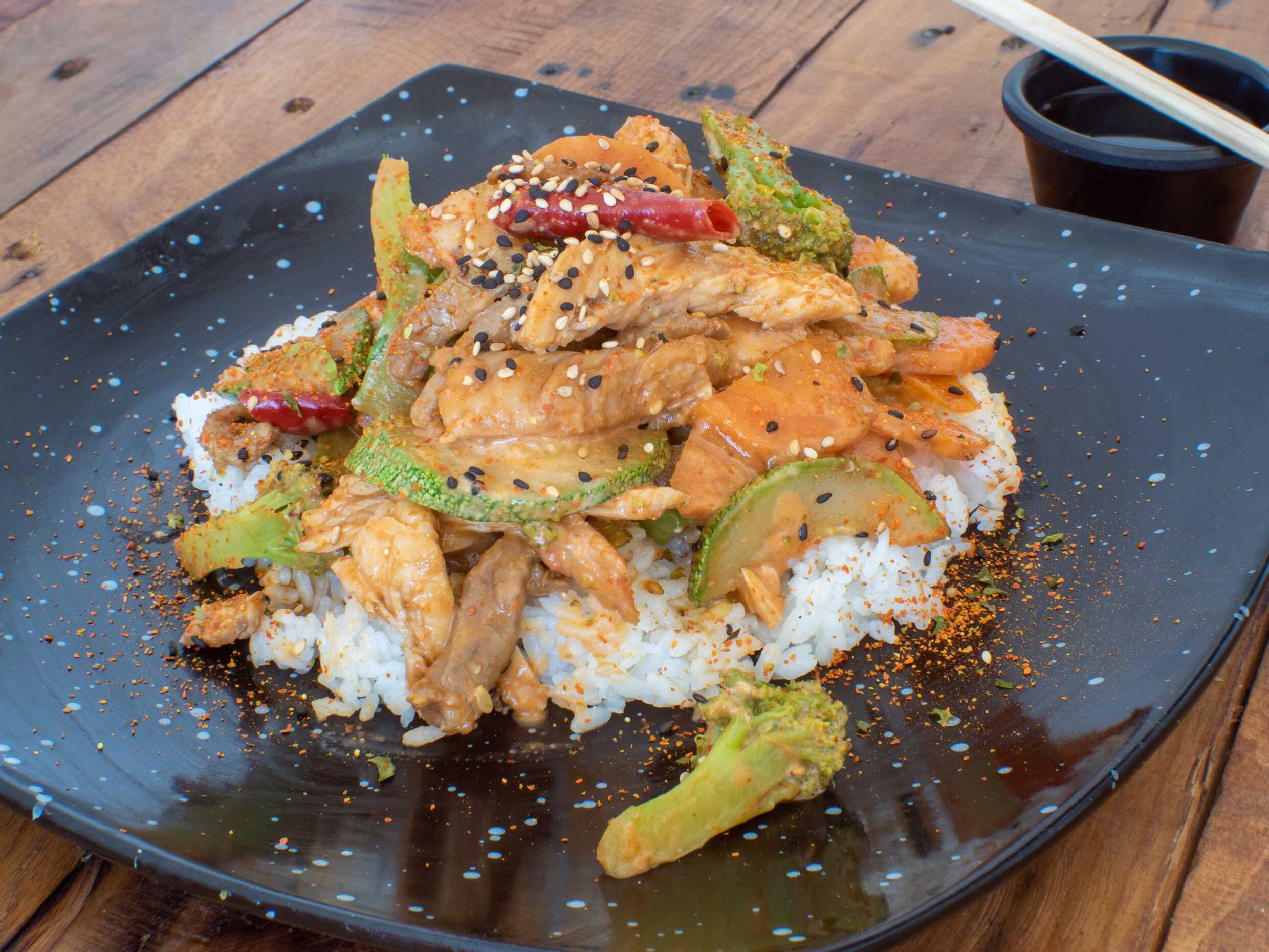 Verduras mixtas, con salsa Teriyaki sobre una cama de arroz blanco.